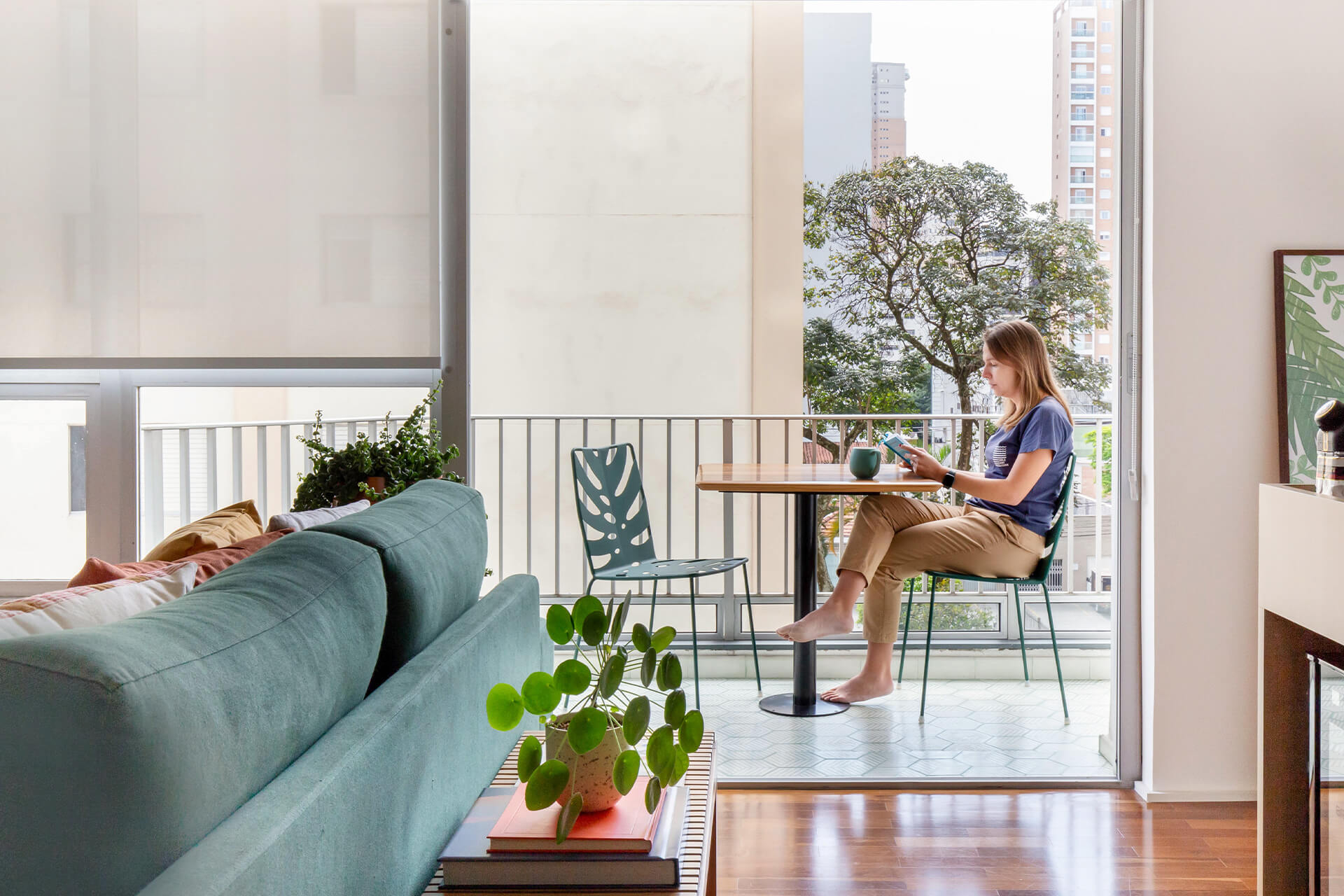 Ao contrário de muitos moradores do prédio, que optam por fechar a área externa e integrá-la à sala, o casal preferiu manter a varanda como na planta original: “Queríamos um espaço separado mesmo, onde pudéssemos sentir o vento na cara” contam.