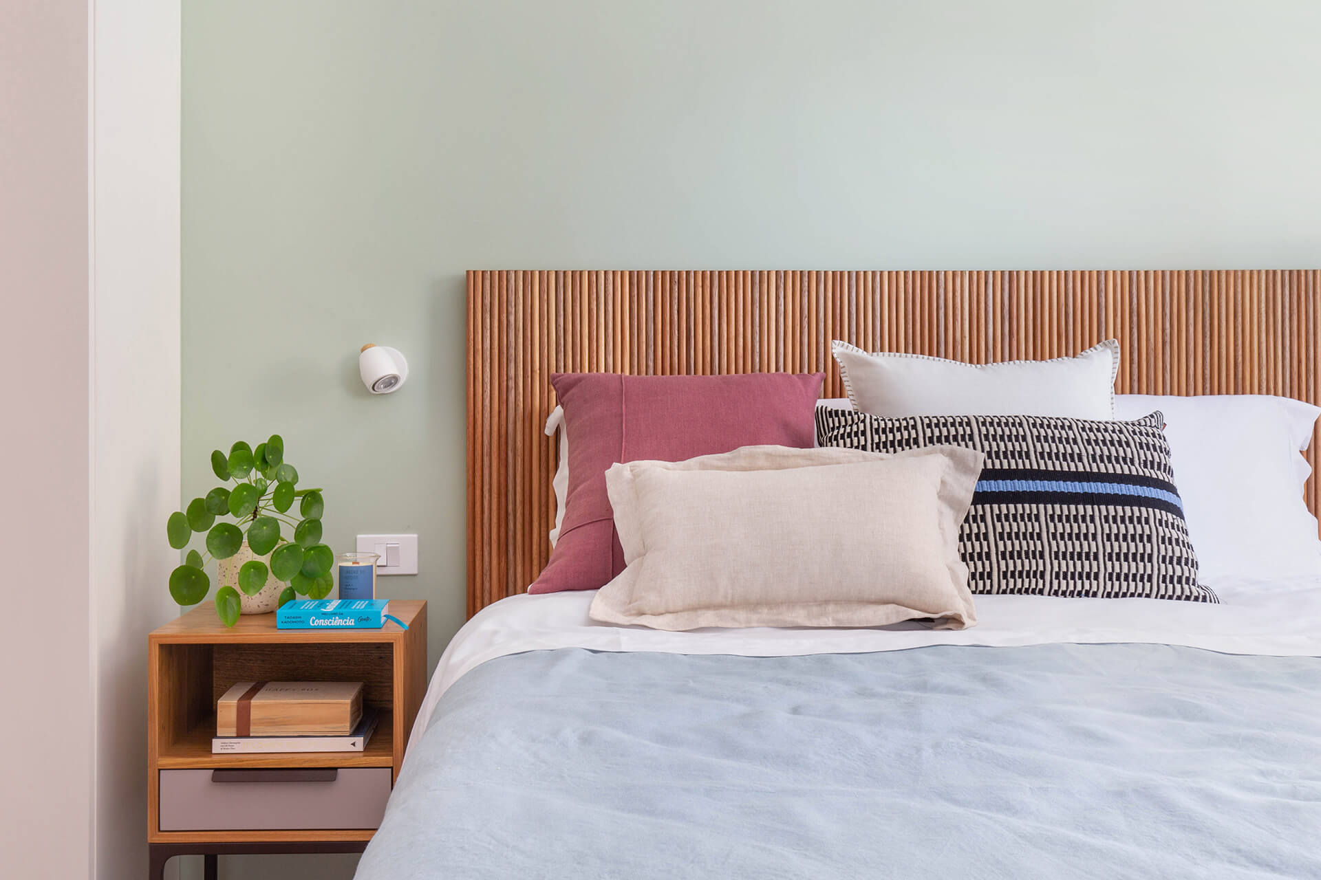 Os escolhidos para esse quarto acolhedor foram: cama Hi-fi, mesa de cabeceira Loft e muitas almofadas.