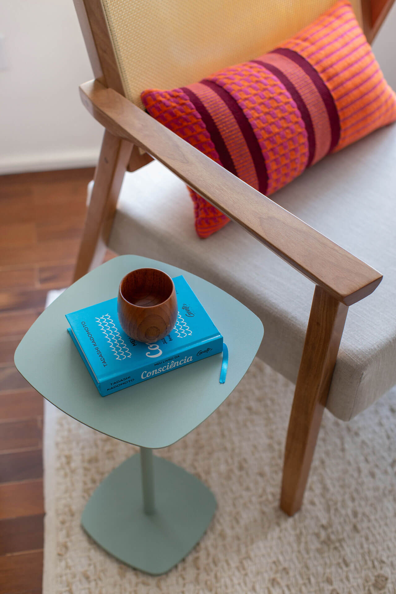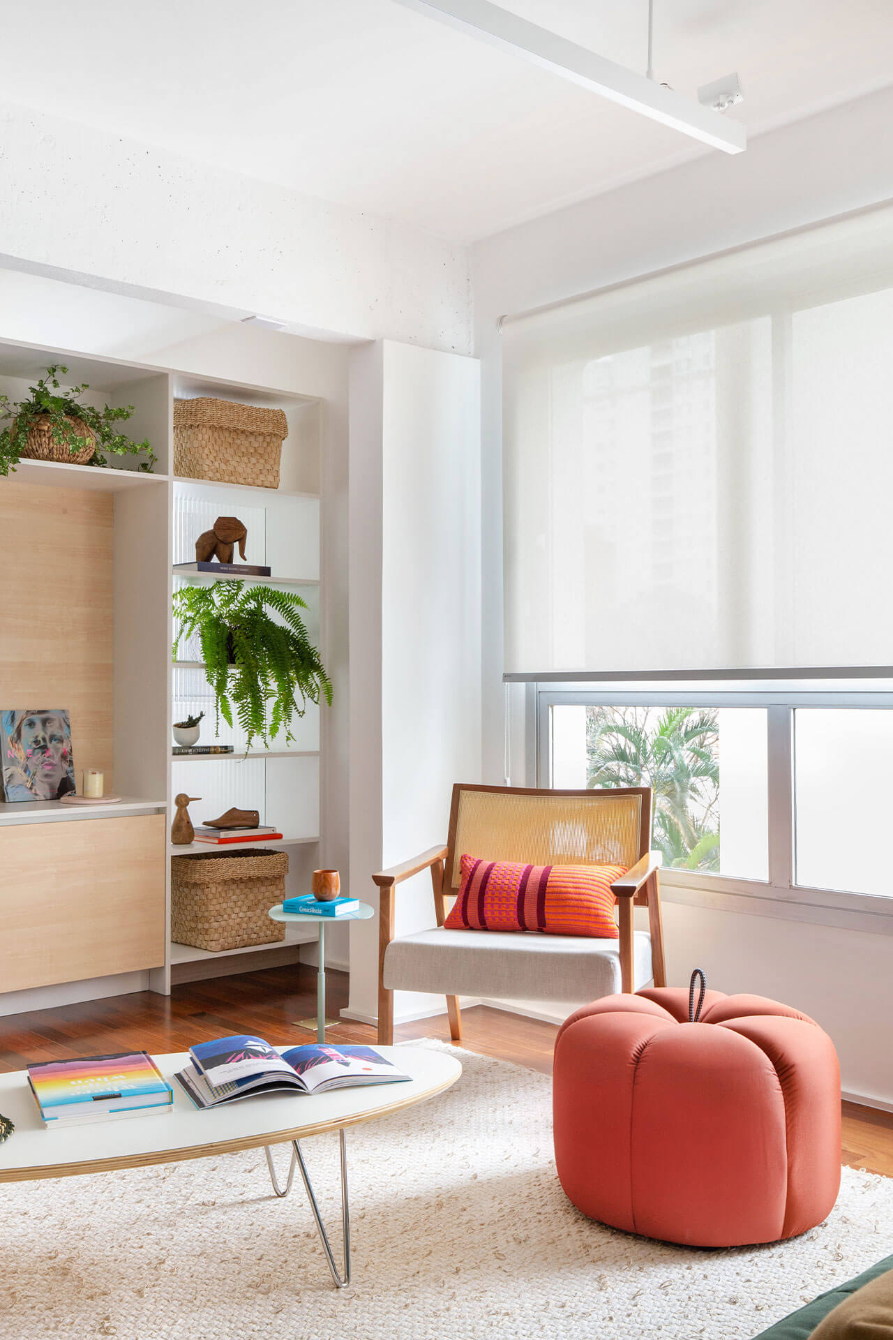 O apartamento, bastante colorido, recebe alguns elementos neutros para equilibrar, como o banco Nô.