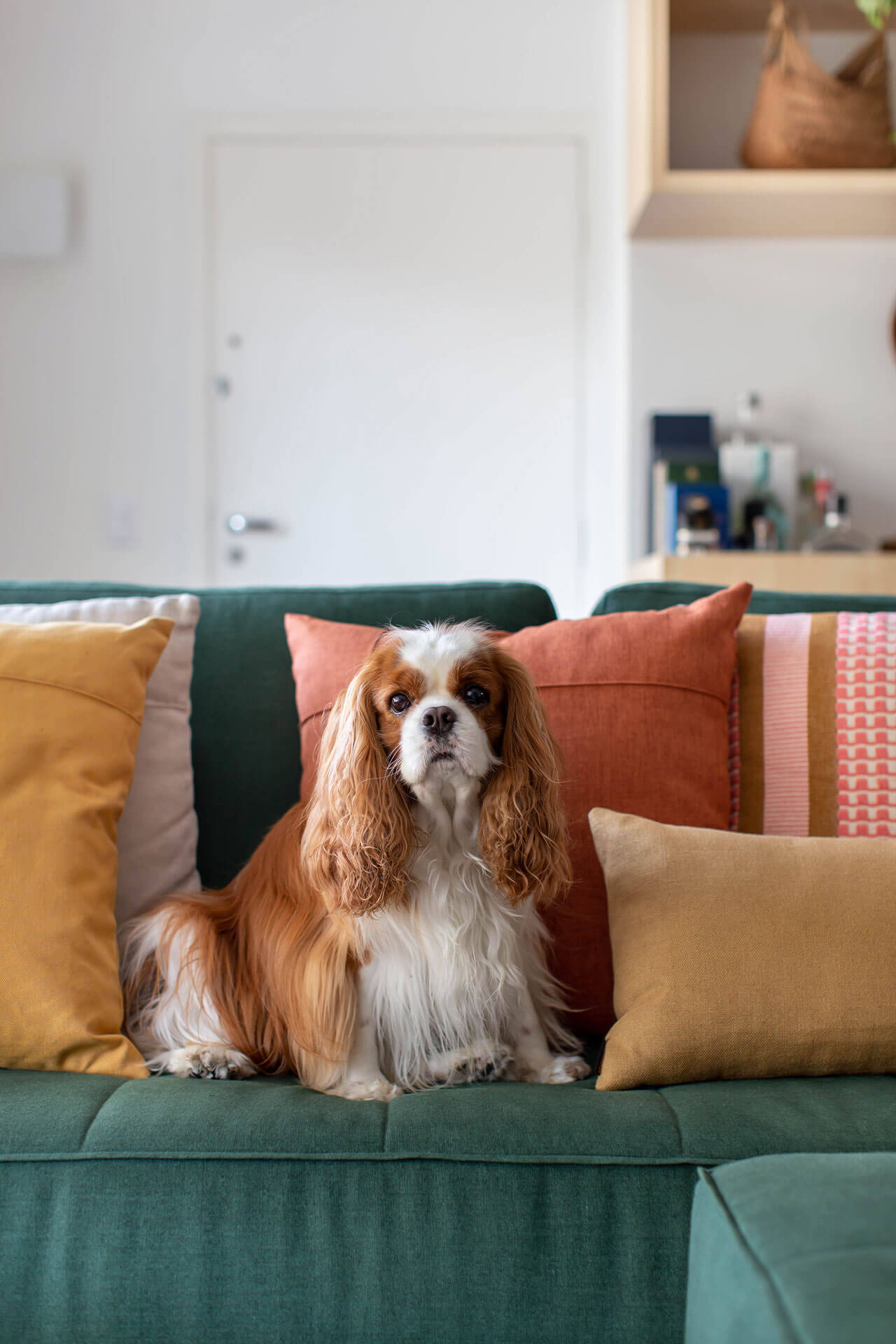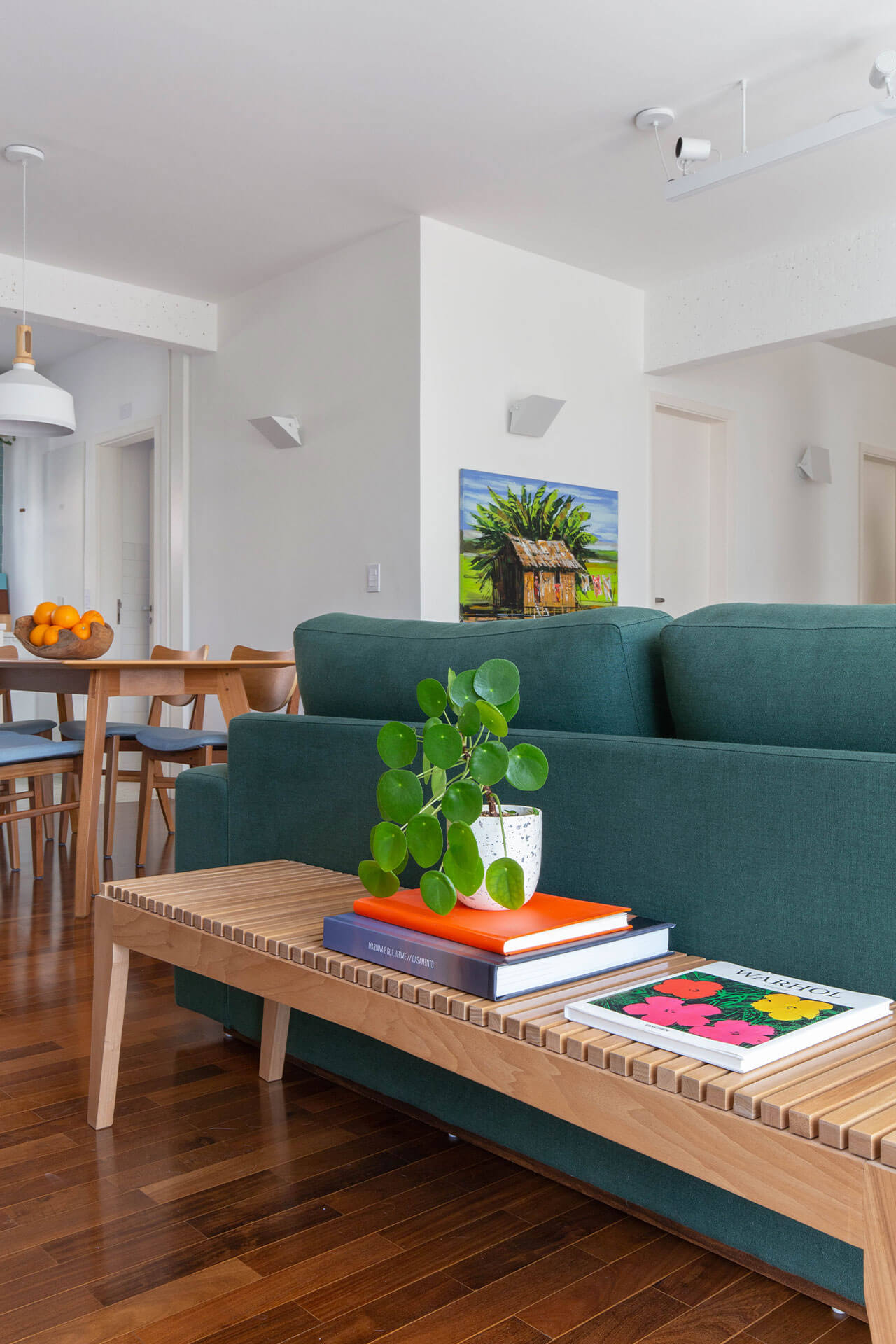 Na hora de escolher os móveis, Mari e Gui procuraram peças atemporais, de qualidade, com design e sem muita extravagância. E de todas as peças, a preferida do casal é o sofá verde, pois além de lindo, é confortável e se transformou em um lugar onde eles passam muito tempo.
