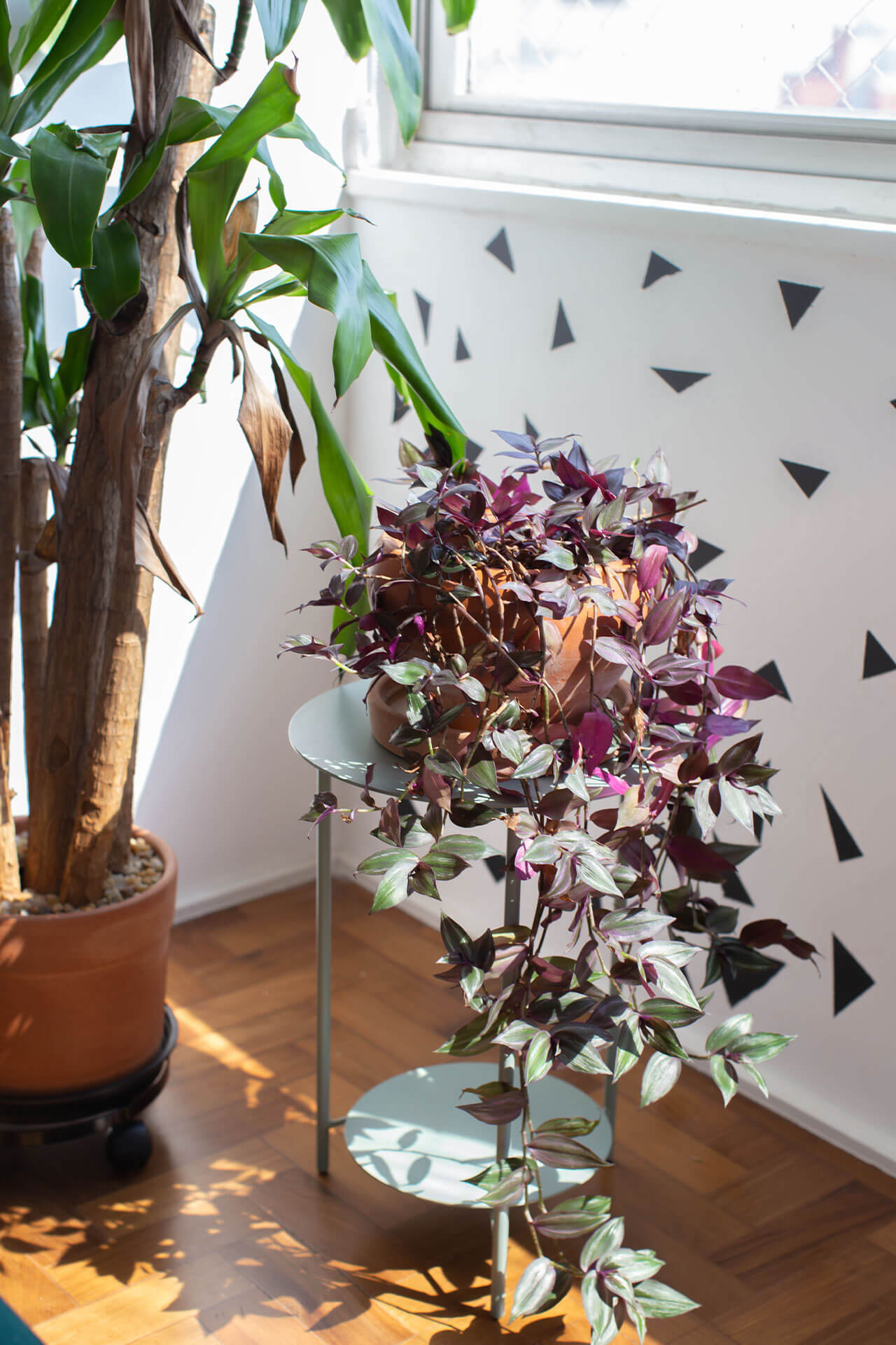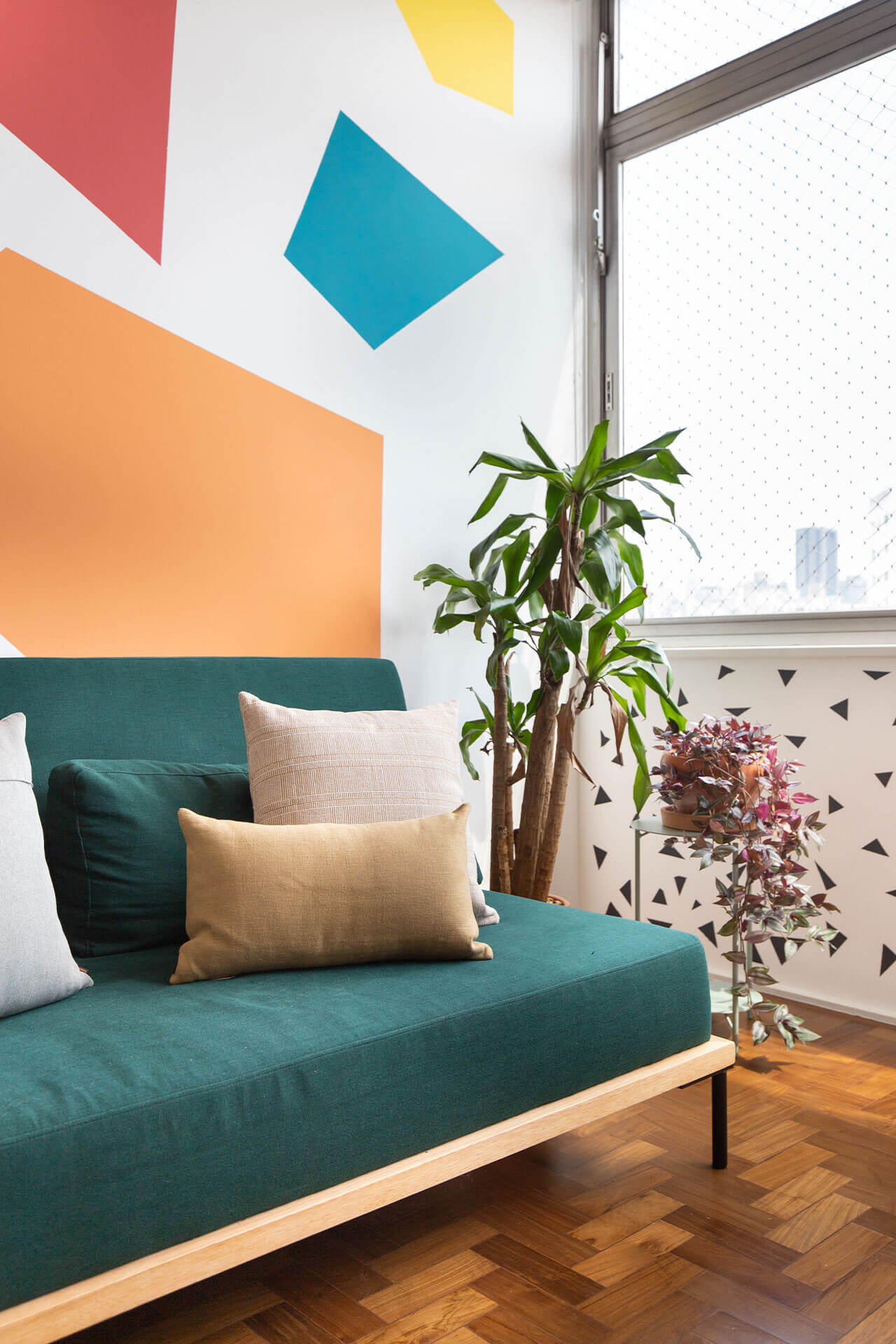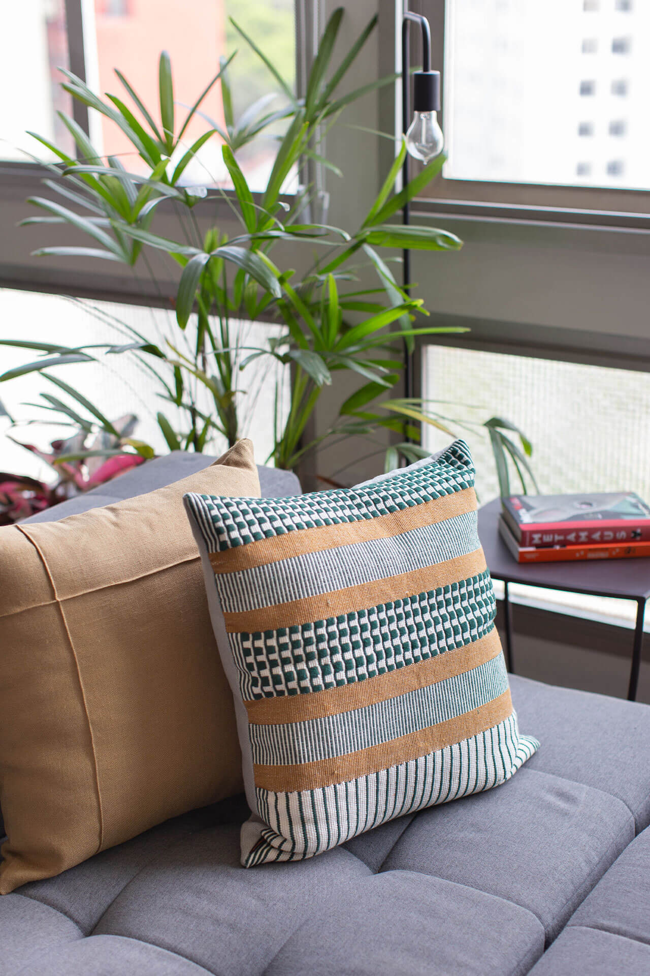 Detalhes que fazem a diferença: almofadas coloridas, mesa lateral Pólen e muitas plantas.