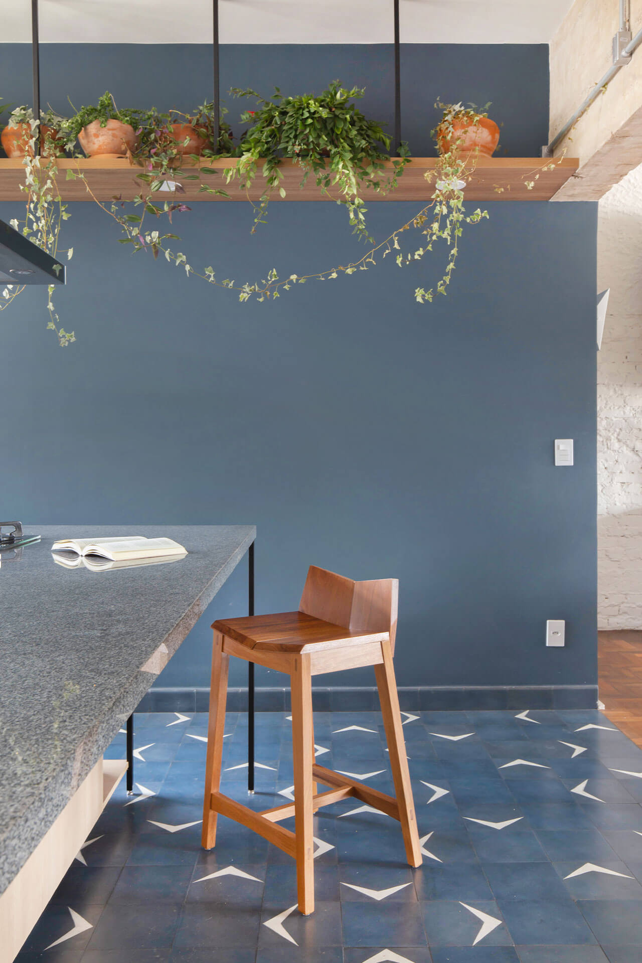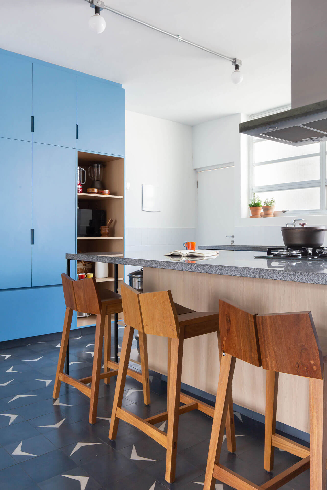 A cozinha, que era fechada, ficou totalmente aberta para a sala e ganhou uma grande ilha com bancos Kinzo Médio.