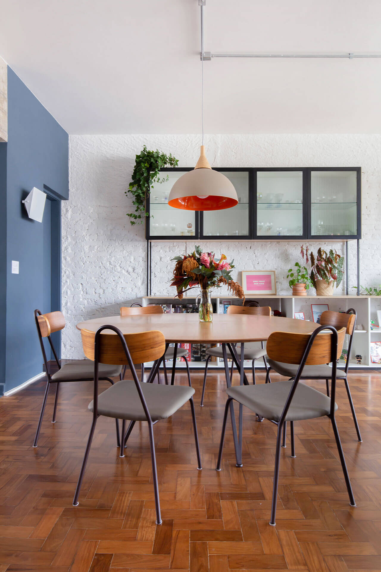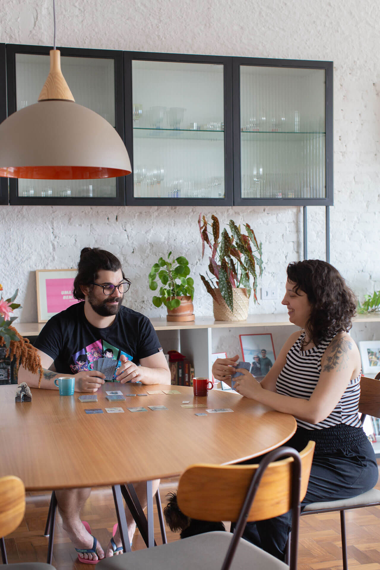 A escolha da mesa de jantar foi um ponto importante para o casal. Eles sempre gostaram de organizar jantares e noites de jogos em casa e, por isso, precisavam de um modelo que acomodasse várias pessoas e que ao mesmo tempo fosse leve e fácil de mudar de lugar. A escolhida foi a mesa de jantar Nômade, aqui muito bem acompanhada pelas cadeiras Volta e pela luminária Carlota.