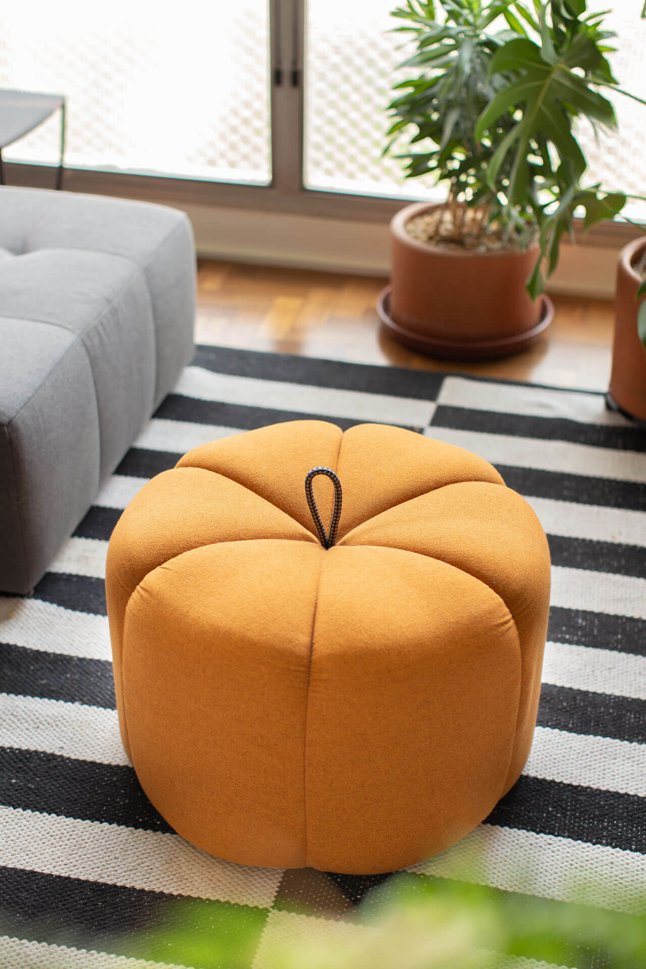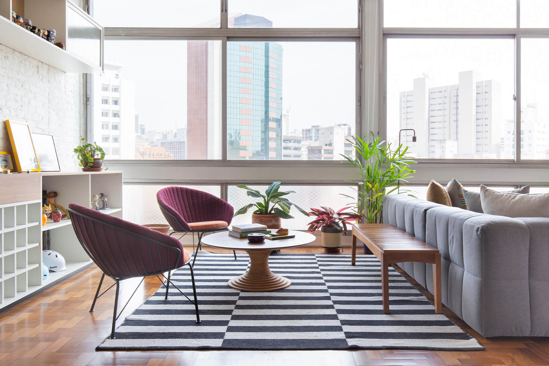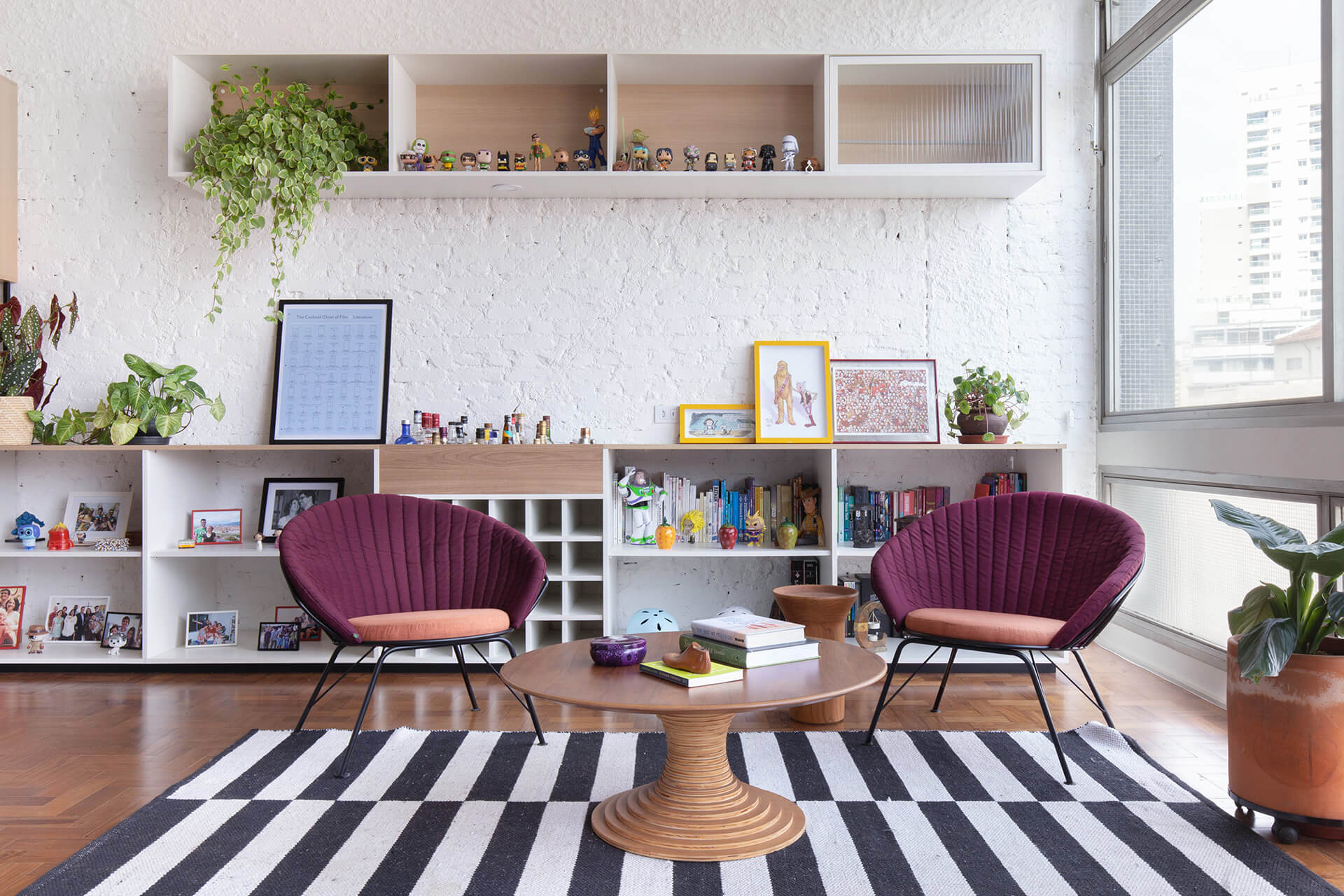 Poltrona Leque, mesa de centro Saturno e banco Nô.O Gabriel e a Elea se mudaram recentemente para esse apartamento duplex, com janelas grandes e bem iluminado. Mas para ele ficar do jeito que está agora, foram alguns meses de obra com bastante quebradeira para integrar os ambientes do andar térreo e criar mobilidade.