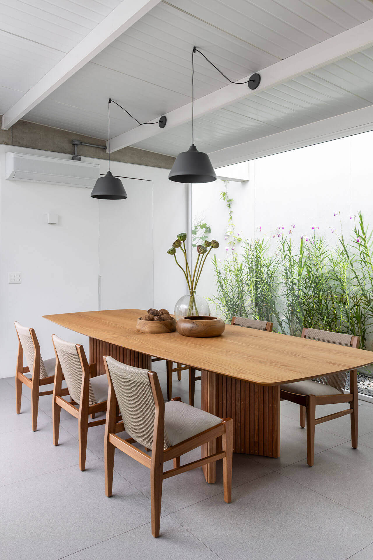 A Casa Yano é toda integrada – sala, cozinha, área da churrasqueira e jardim de inverno. Para valorizar o minimalismo da cozinha e sala de estar, pensamos em peças sofisticadas e com traços inusitados, como a Mesa Enseada e Cadeiras Kinzo.