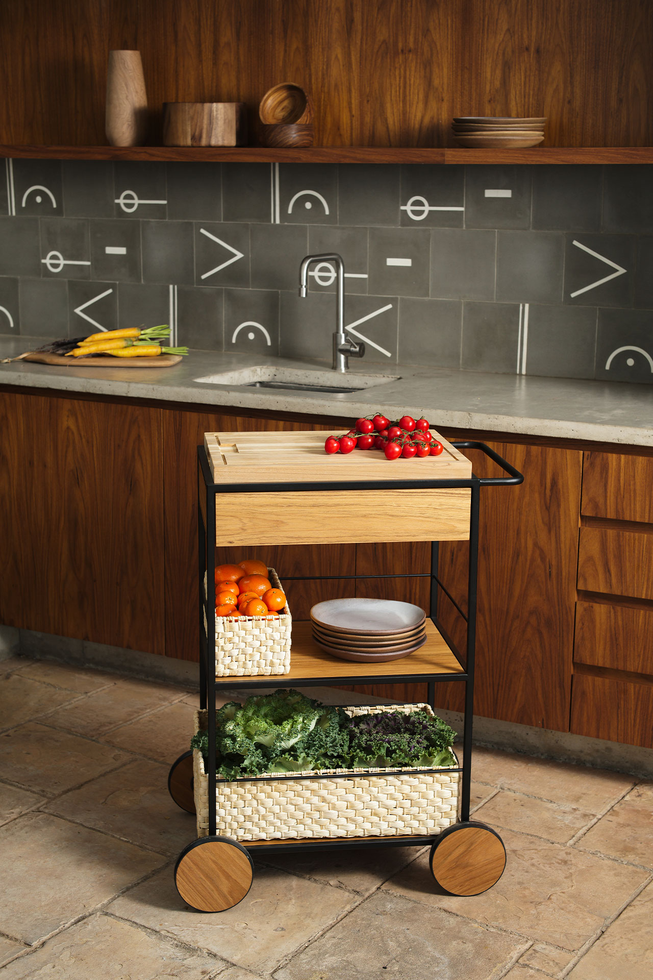 A Cadeira Spaghetti, um clássico da marca FJ Pronto pra Levar! está em linha há mais de 36 anos. Junto a ela, a Mesa Loft é um coringa e aqui foi feita com tampo ripado em madeira maciça. O Carrinho Salsa, uma peça versátil, serve de apoio para vários usos sem perder o charme.