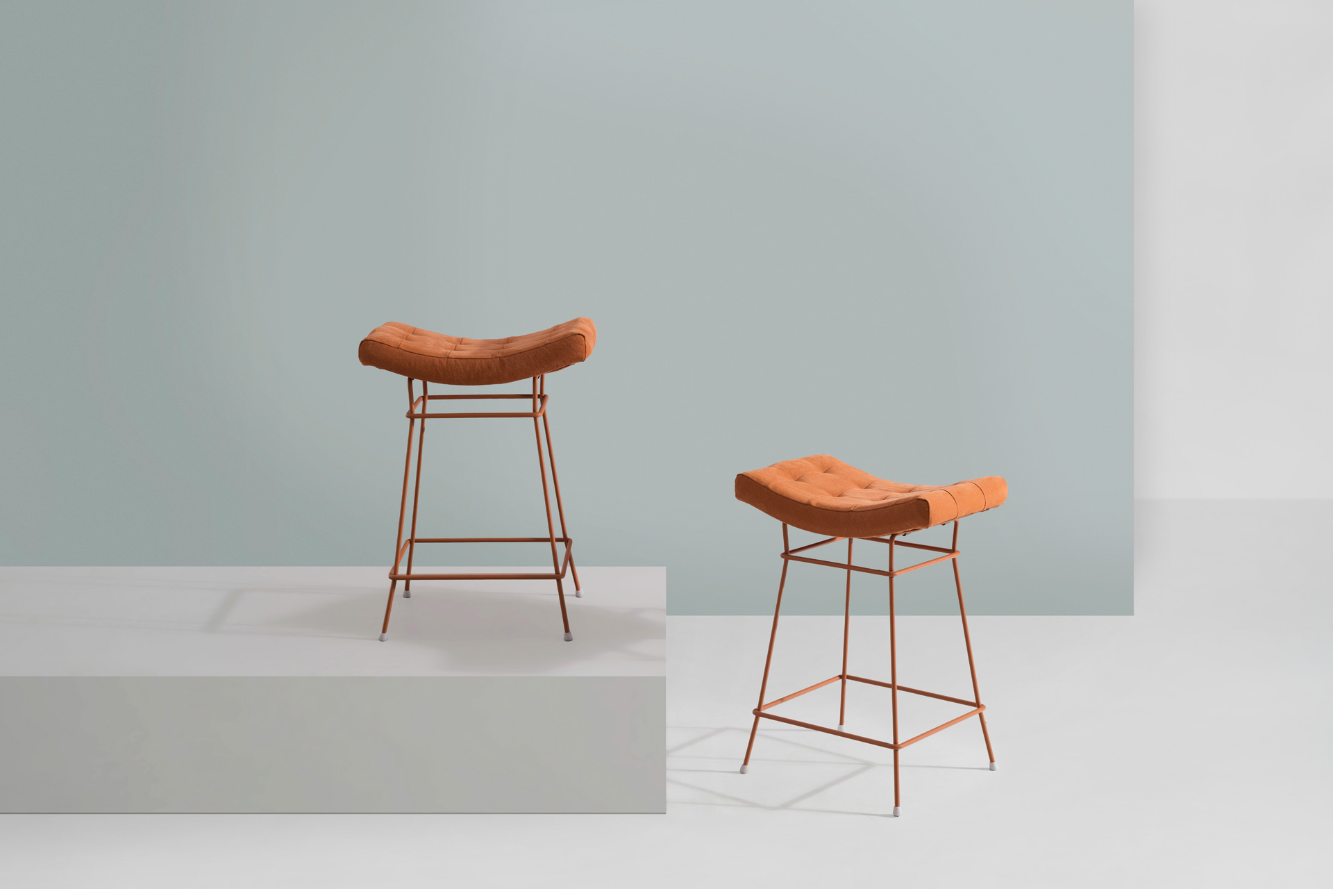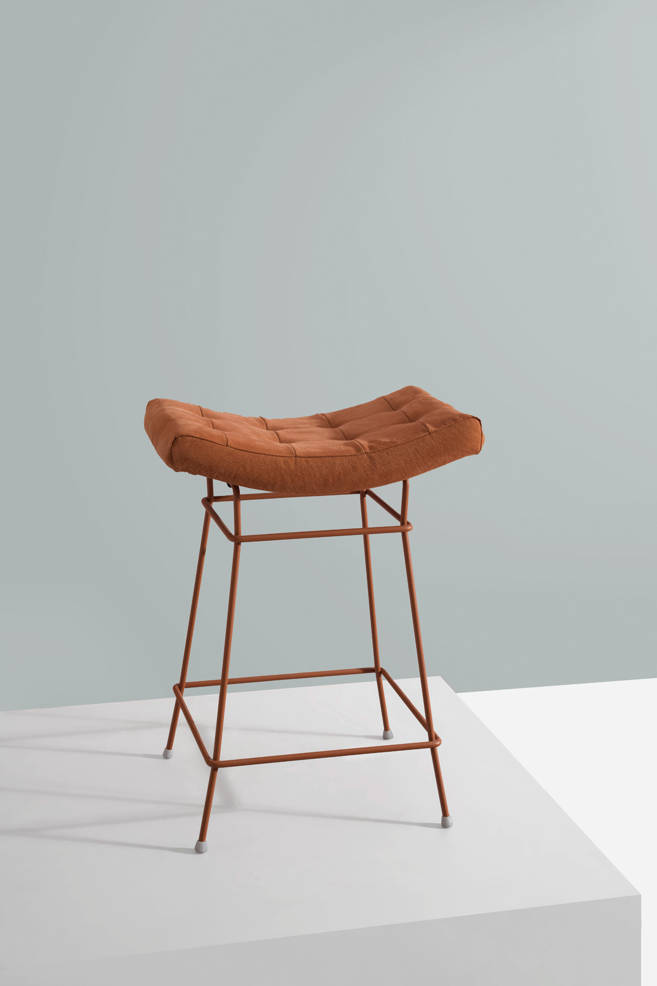 Estrutura em aço carbono maciço com pintura eletrostática a pó e assento em compensado laminado curvo com estofamento em tecido ou couro sintético.