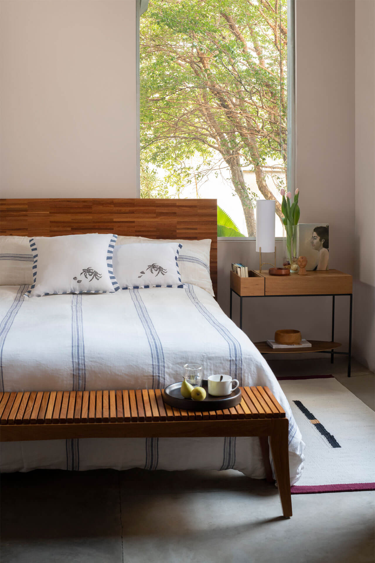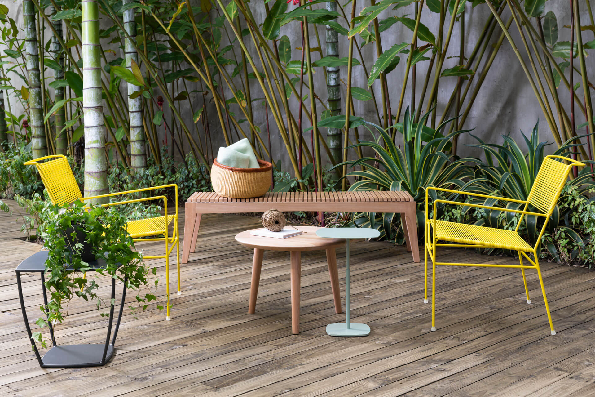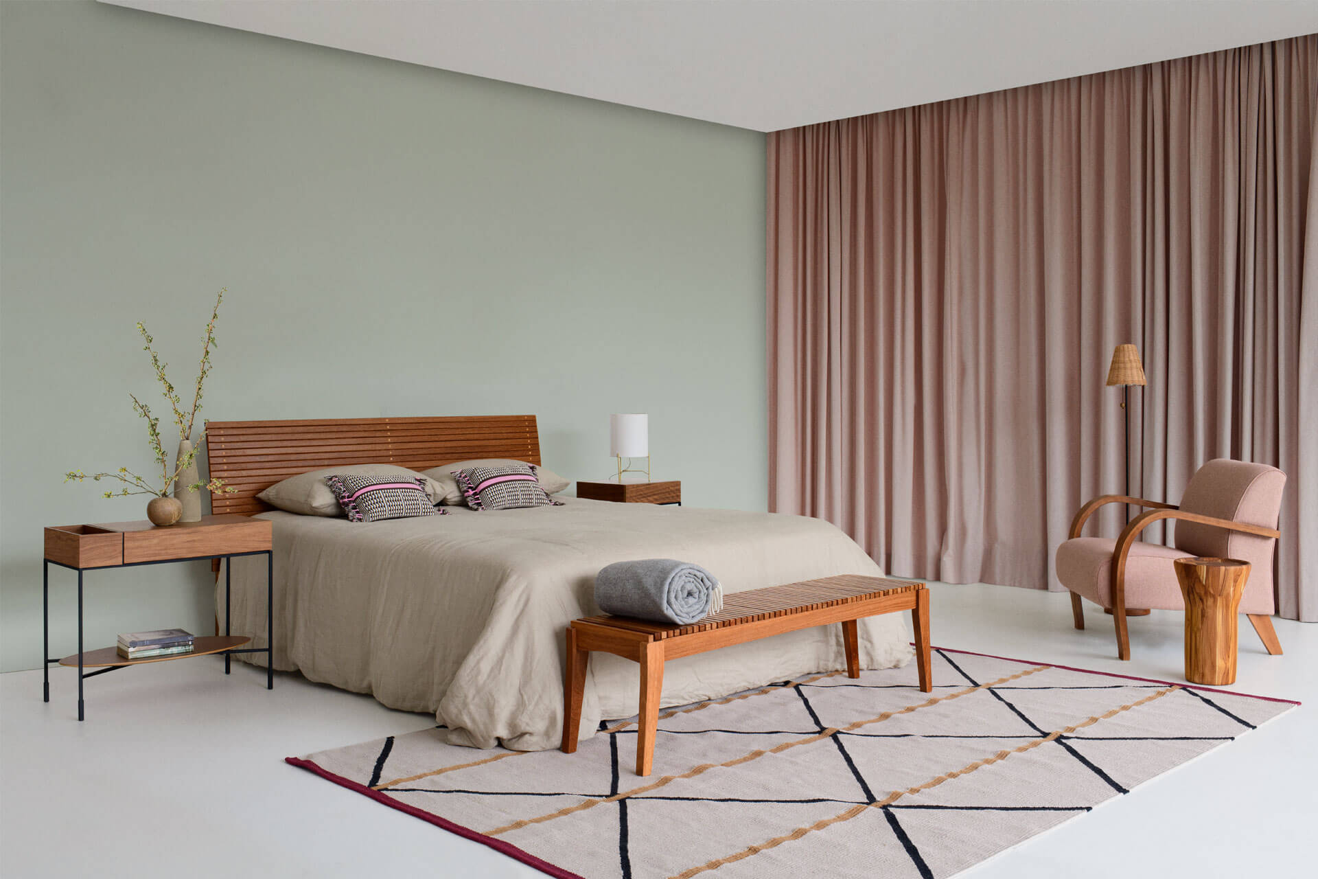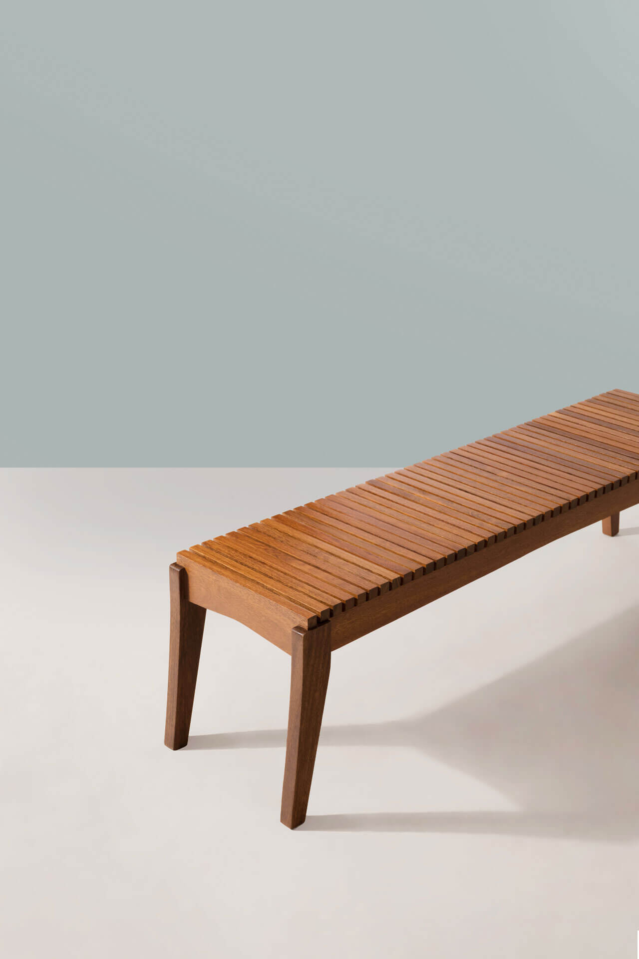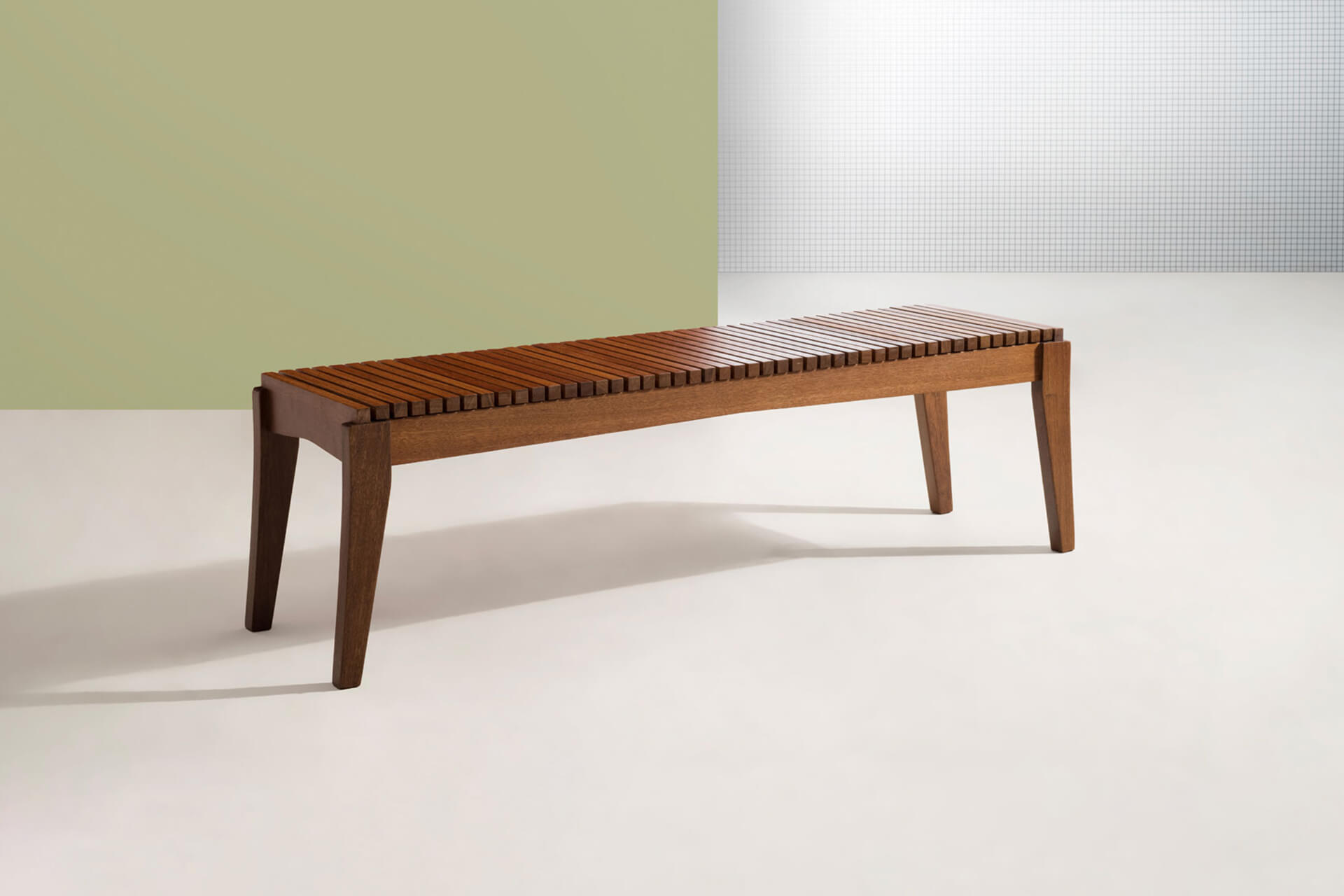 Uma peça versátil, toda feita de madeira maciça, que tem como característica principal o assento feito com ripas de madeira. Seu desenho limpo permite composições em diferentes ambientes, como salas de estar e jantar, halls, quartos e espaços comerciais. Além de banco, pode servir como mesa de centro ou apoio para encosto de sofás.