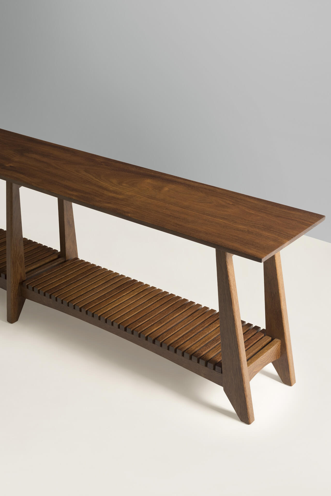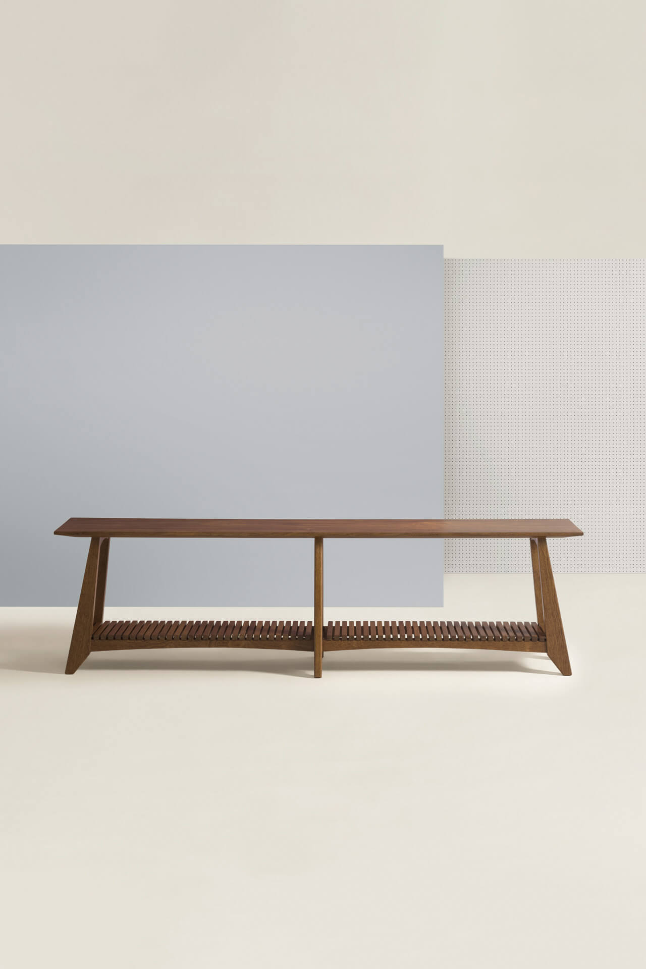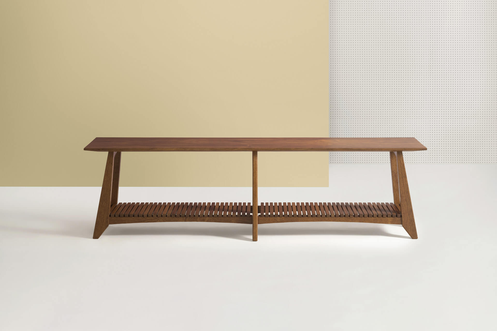 Com desenho limpo e formas retas, o Aparador Brasília valoriza o uso da madeira maciça. Seu tampo inferior ripado destaca o desenho do tampo superior - uma prancha de madeira maciça chanfrada nas bordas. A peça, multiuso, foi desenhada inicialmente para ser usada como apoio para encostos de sofás “soltos” no ambiente - mas pode perfeitamente ser deslocada para um hall ou para uma sala de jantar - com a função de receber as refeições para a mesa ficar livre. Conheça também sua versão Banco.
