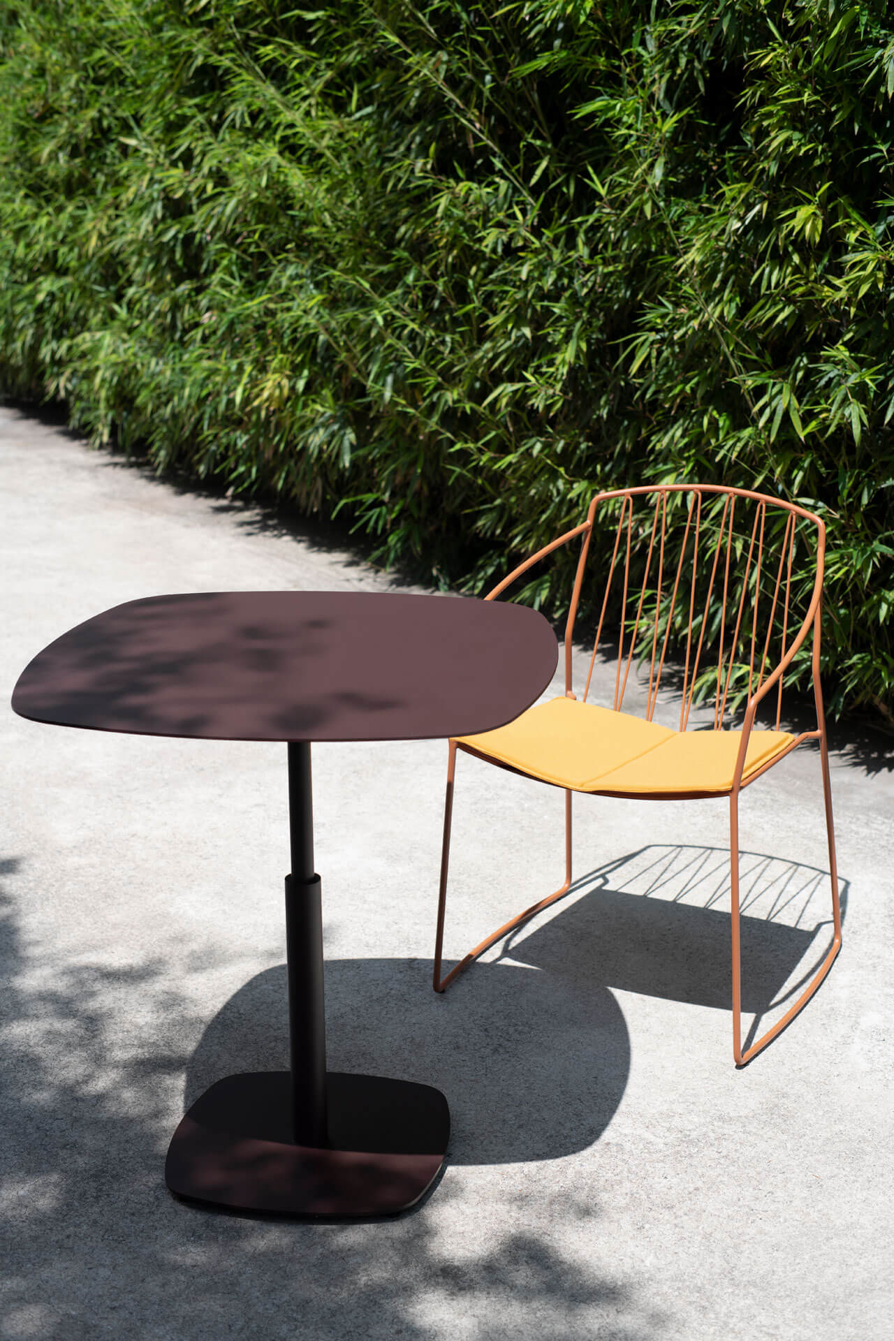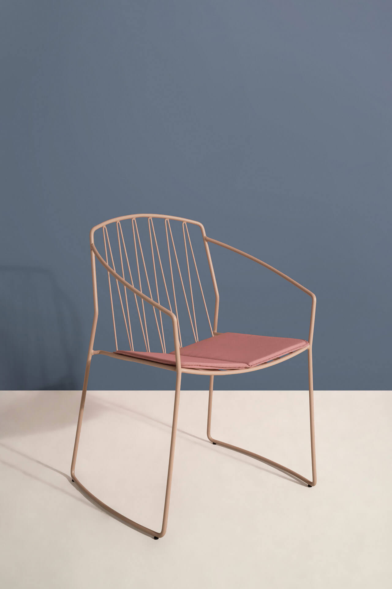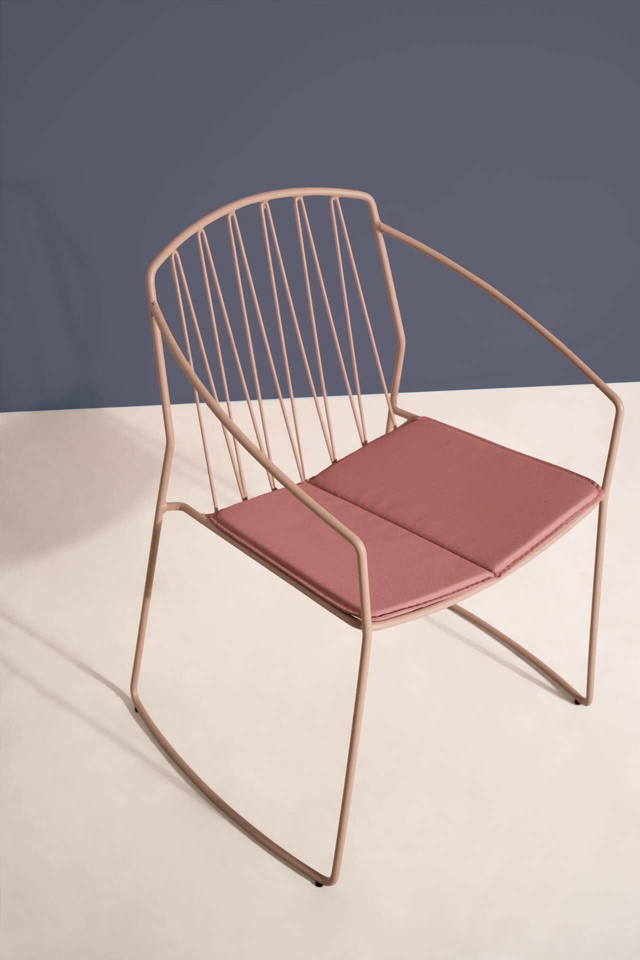 De desenho simples e divertido, a cadeira Zig Zag traz uma proposta descontraída para seu ambiente. projetada para ser utilizada em área externa coberta, mas também é uma ótima opção para espaços internos como salas e cozinhas.A peça brinca com a combinação entre cores da estrutura metálica e a delicada almofada da linha, garantindo mais conforto ao sentar. Está disponível também na versão sem braços..