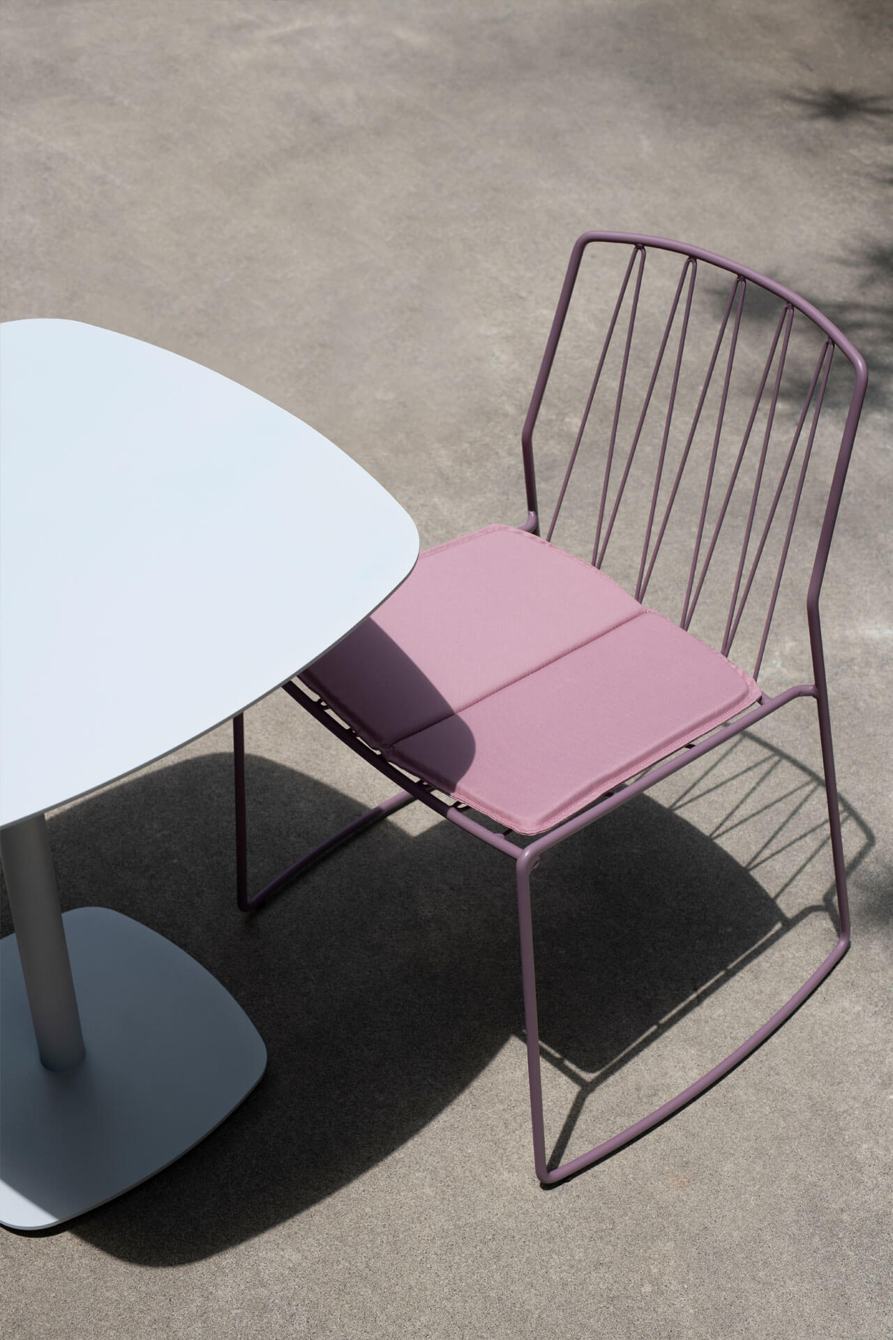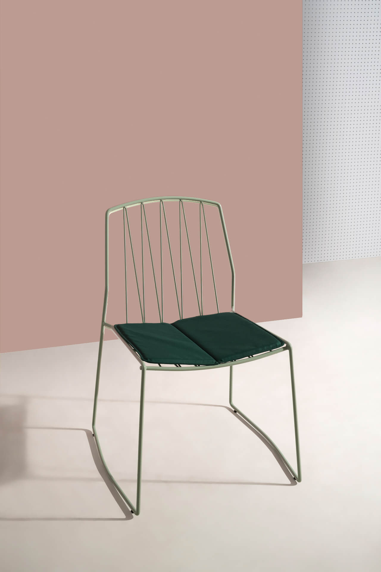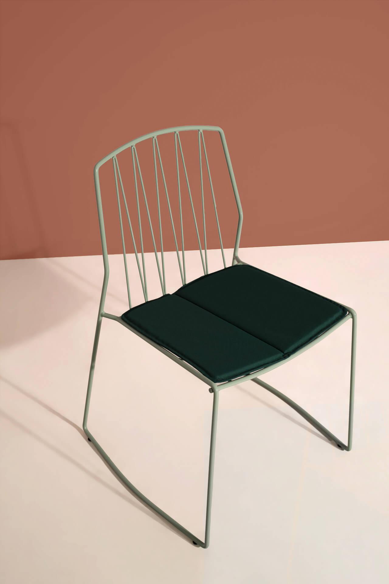 De desenho simples e divertido, a cadeira Zig Zag traz uma proposta descontraída para seu ambiente. Foi pensada para ser utilizada em área externa coberta, mas também é uma ótima opção para espaços internos como salas e cozinhas.A peça brinca com a combinação entre cores da estrutura metálica e a delicada almofada da linha, garantindo mais conforto ao sentar. Está disponível também na versão com braços.