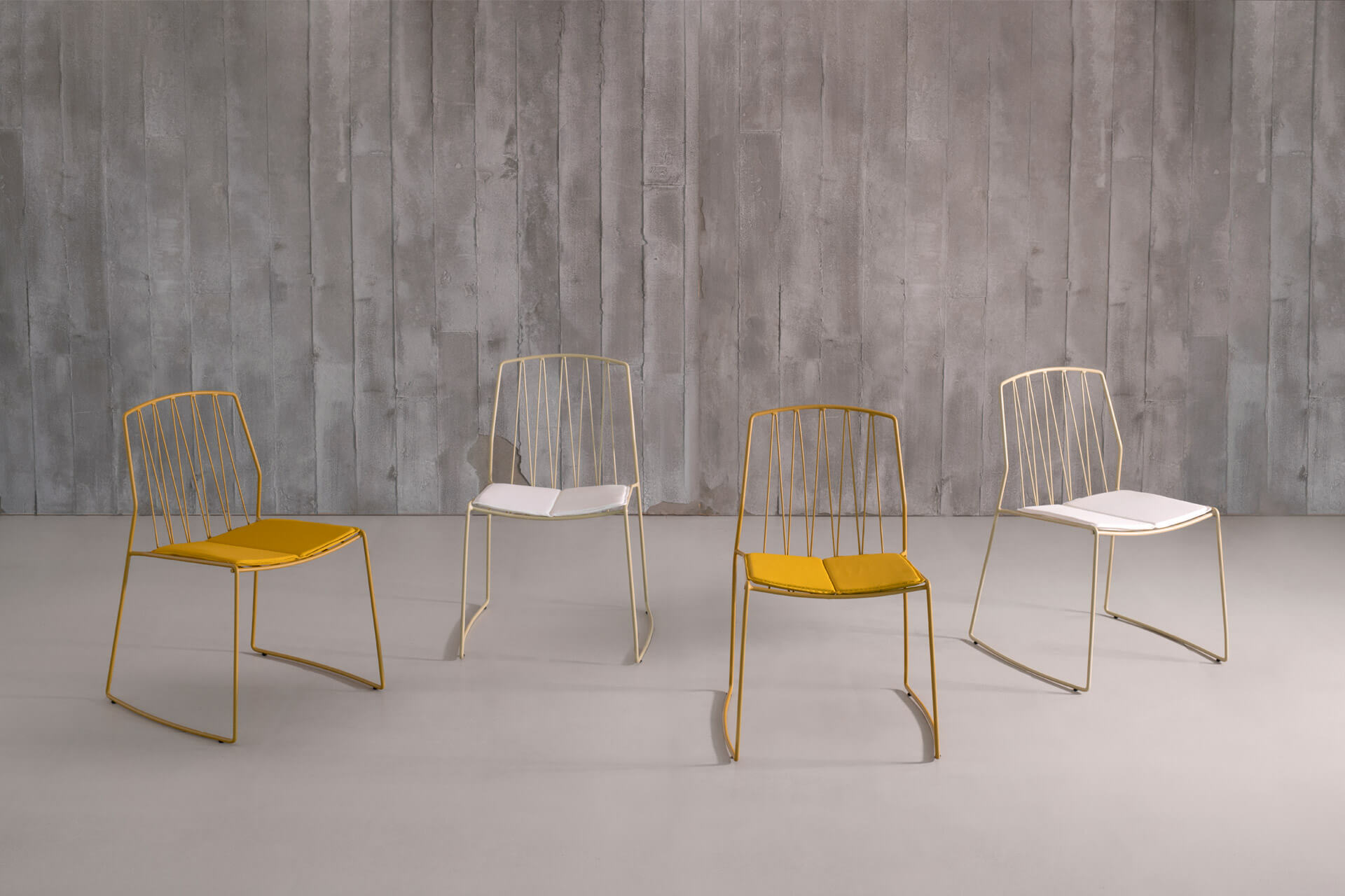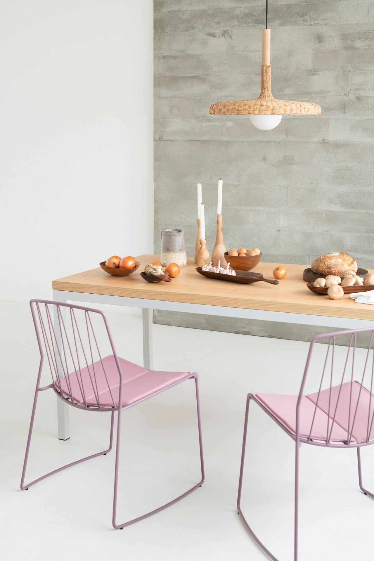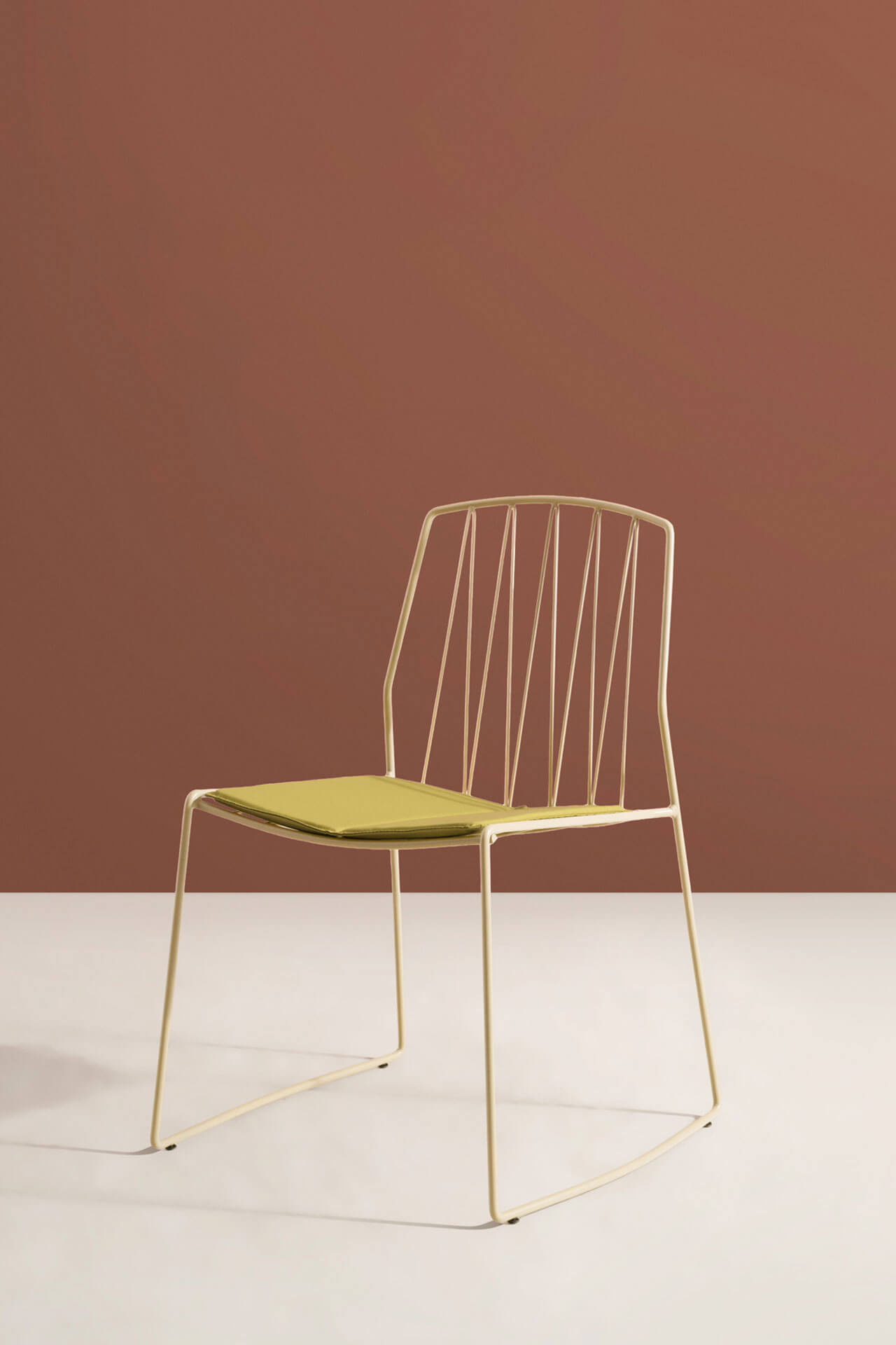 De desenho simples e divertido, a cadeira Zig Zag traz uma proposta descontraída para seu ambiente. Foi pensada para ser utilizada em área externa coberta, mas também é uma ótima opção para espaços internos como salas e cozinhas.A peça brinca com a combinação entre cores da estrutura metálica e a delicada almofada da linha, garantindo mais conforto ao sentar. Está disponível também na versão com braços.