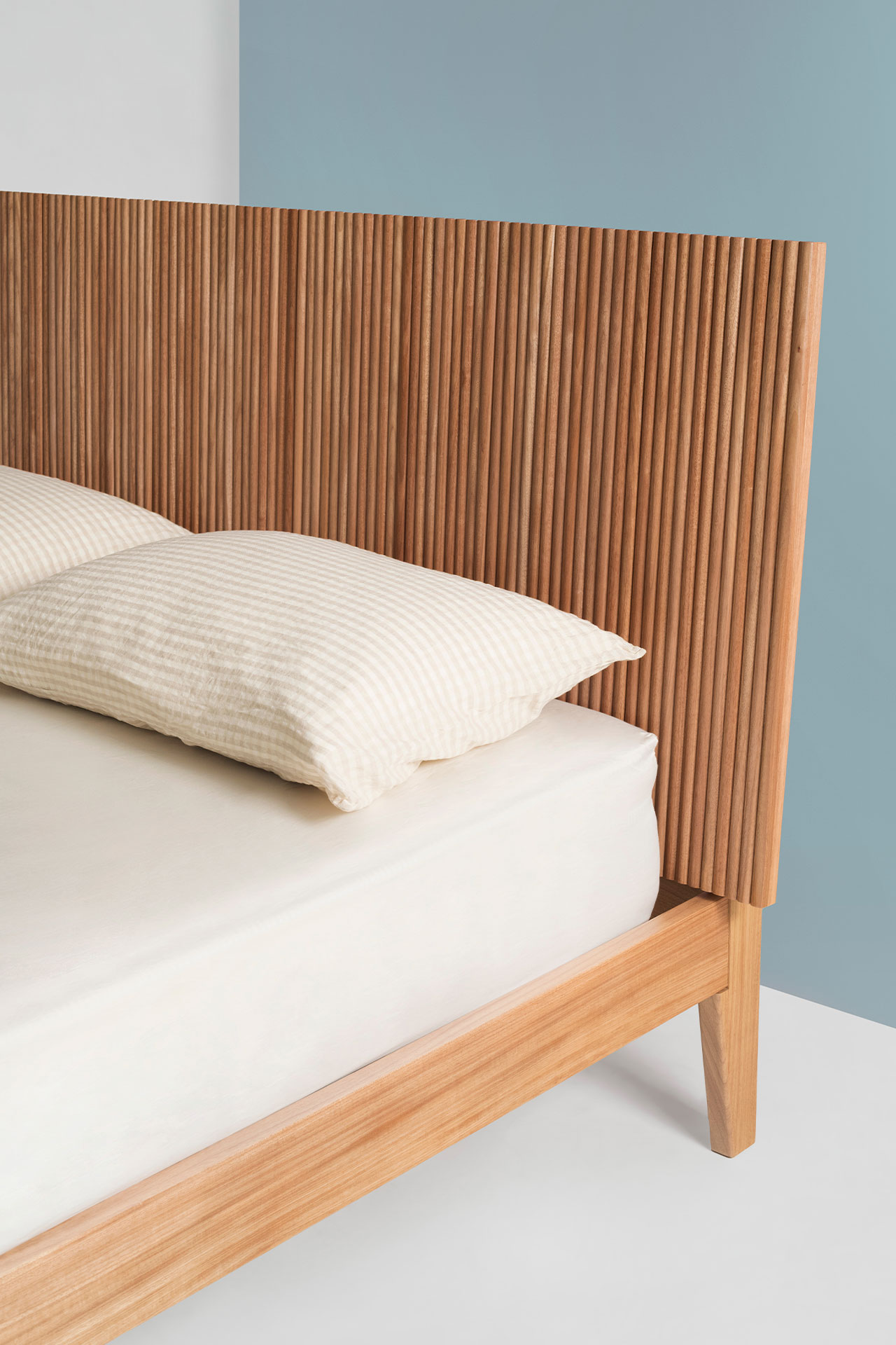 Peça com cabeceira composta por um canelado de madeira maciça trabalhado manualmente - formando um desenho delicado. A Cama Hi Fi foi pensada para acomodar colchões de maior espessura. Disponível nas versões solteiro, casal, queen e king.