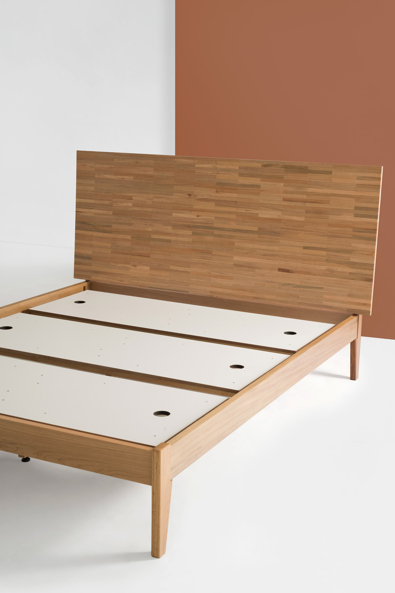 Cabeceira formada por pequenos tacos de madeira maciça trabalhados manualmente (formando um parquet). A cabeceira alta foi pensada para acomodar colchões de maior espessura. Disponível nas versões solteiro, casal e queen.