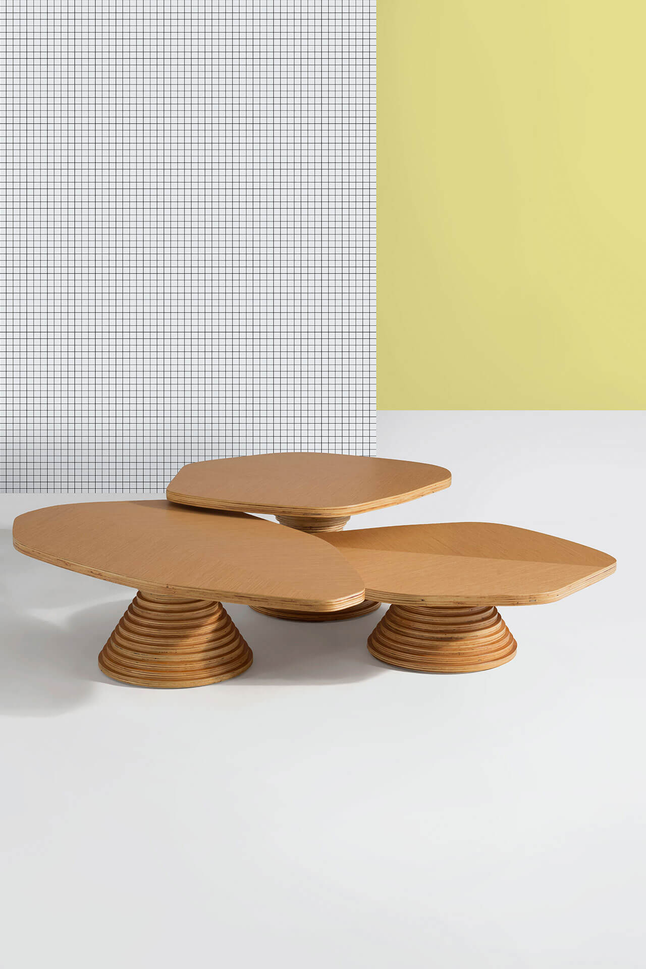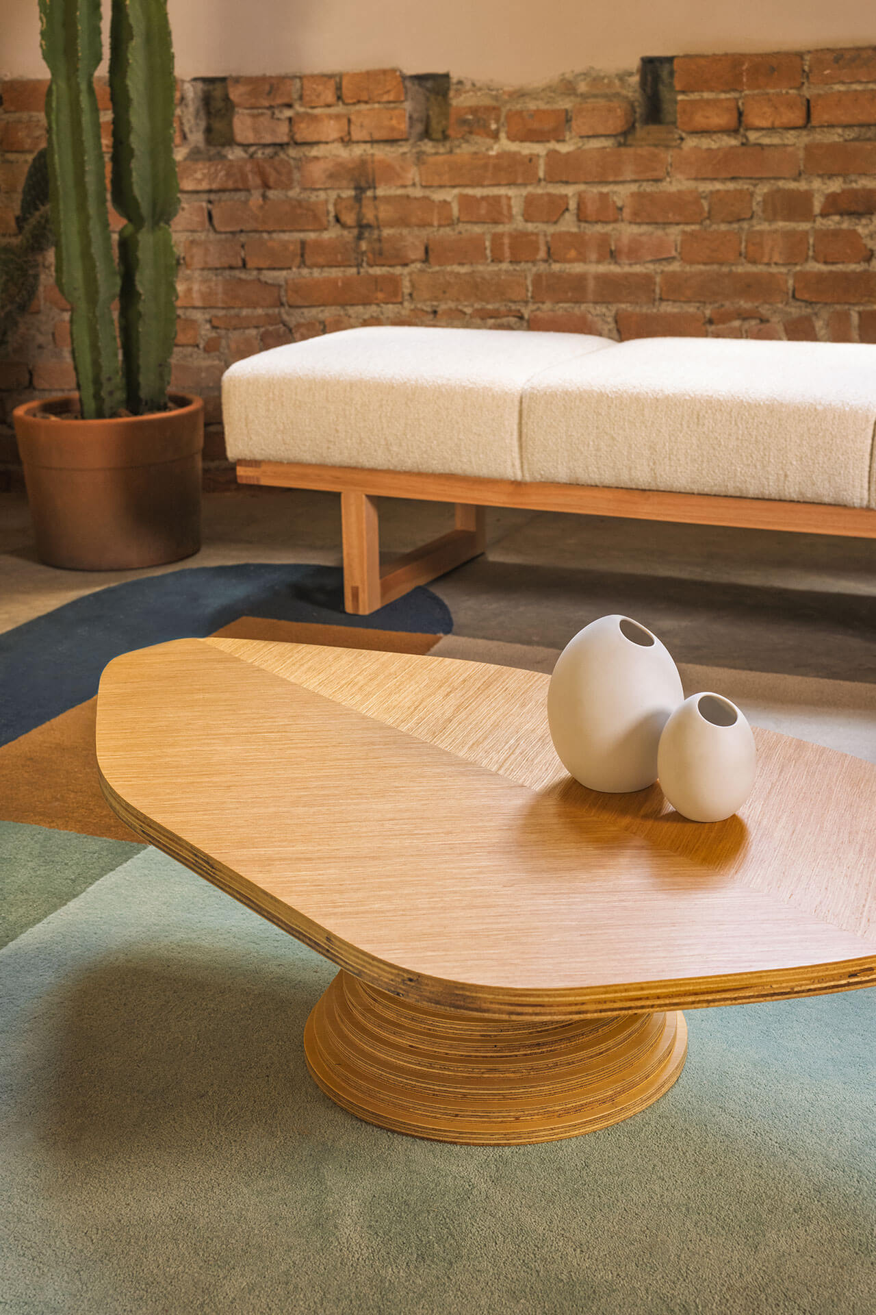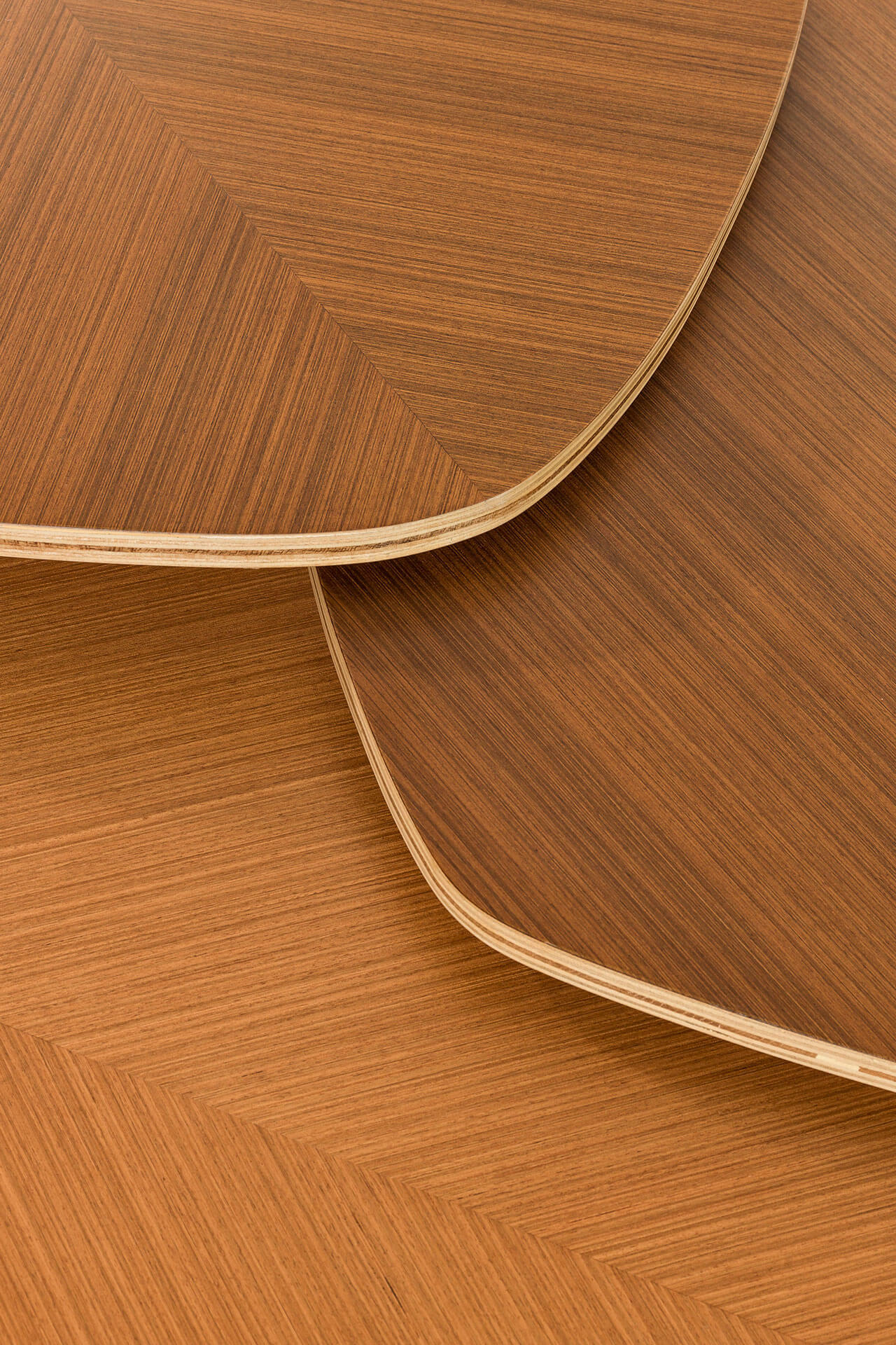 A Mesa de centro Folha possui desenho orgânico que remete à forma das folhas. Sua base central é formada por camadas de compensado sobrepostas e seu tampo em compensado revestido em lâmina pré-composta de madeira natural clara com trabalho de marchetaria, que também remete às folhas.Disponível em uma única altura, pode ser utilizada sozinha ou em conjunto com o modelo complementar Trevo.
