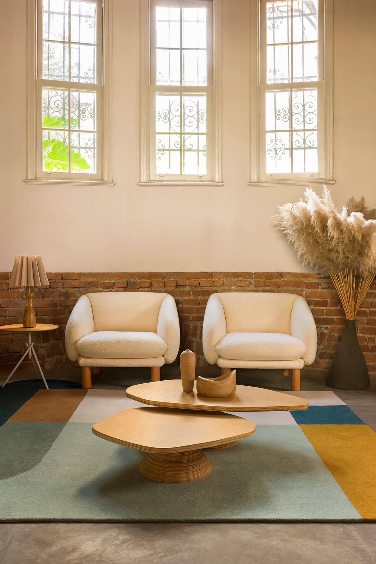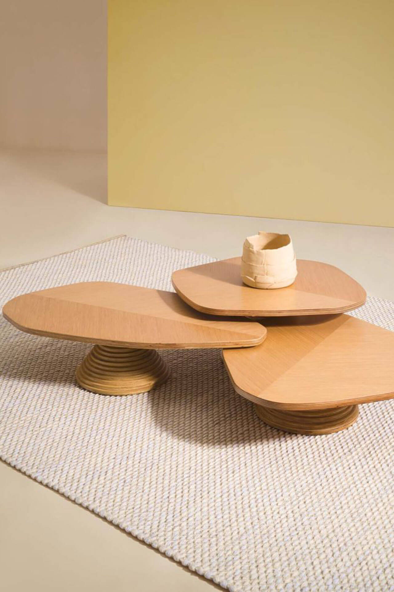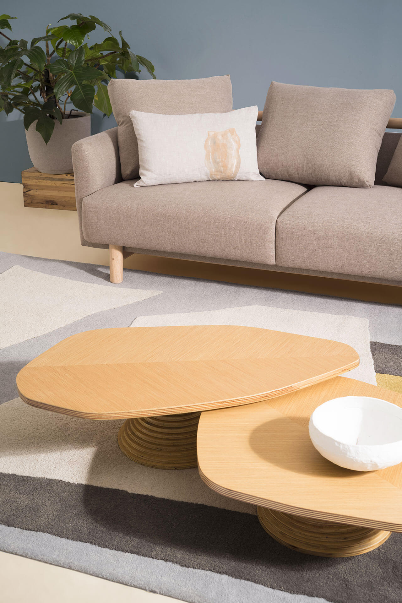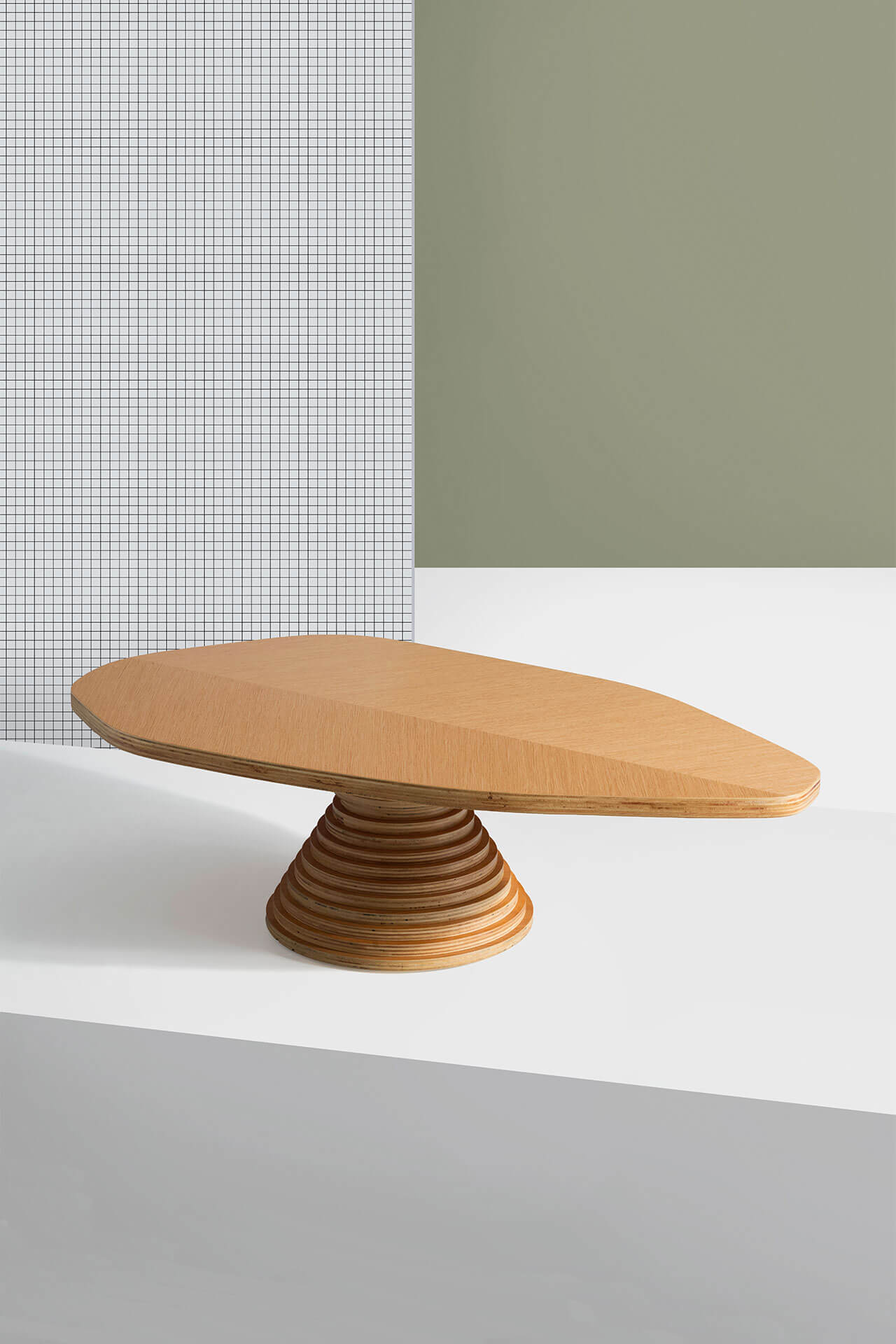 A Mesa de centro Folha possui desenho orgânico que remete à forma das folhas. Sua base central é formada por camadas de compensado sobrepostas e seu tampo em compensado revestido em lâmina pré-composta de madeira natural clara com trabalho de marchetaria, que também remete às folhas.Disponível em uma única altura, pode ser utilizada sozinha ou em conjunto com o modelo complementar Trevo.