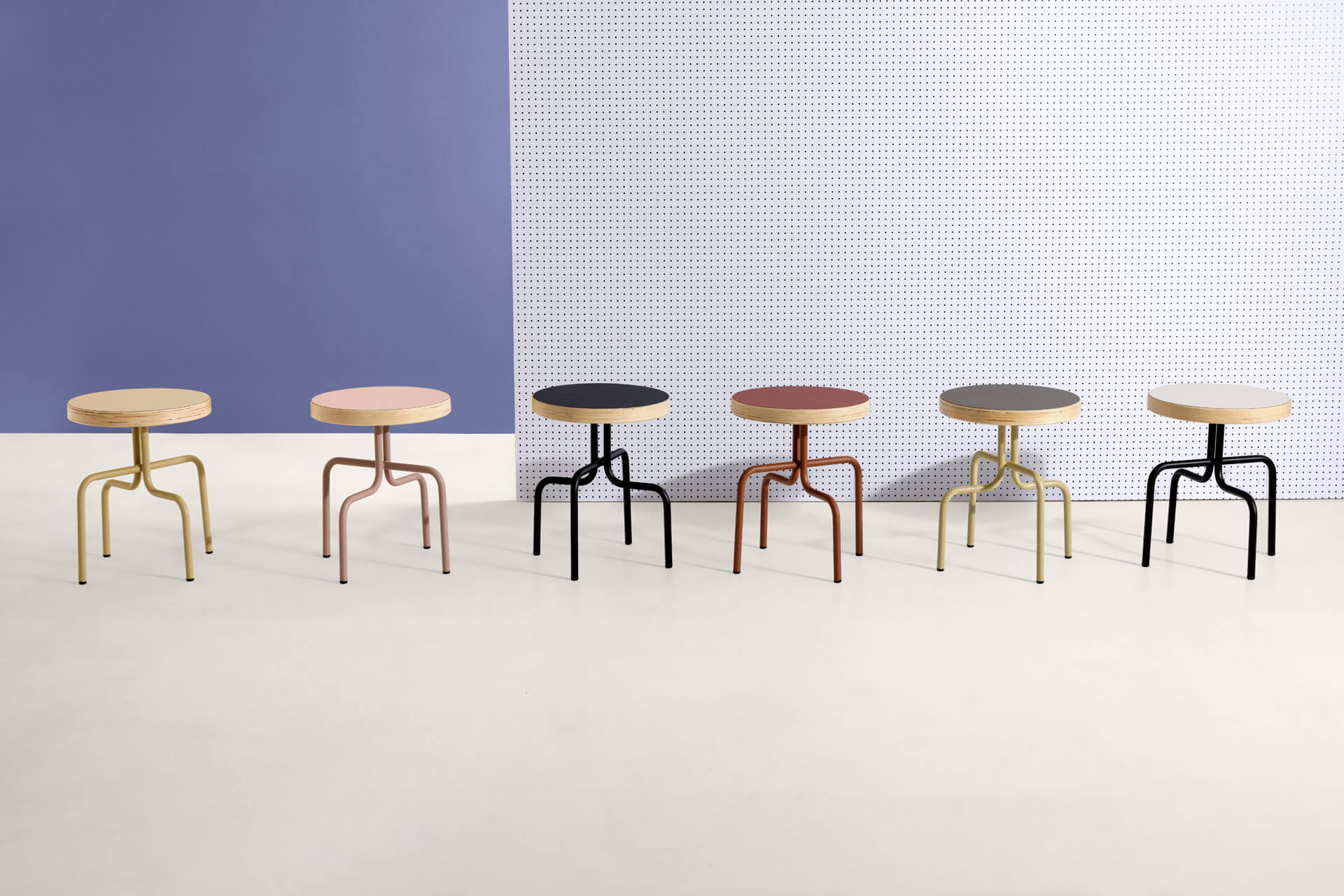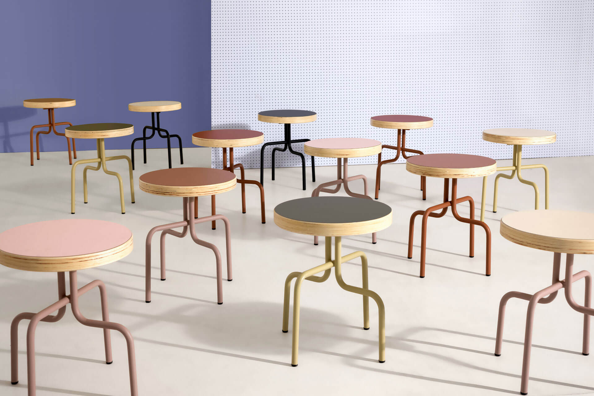 Estrutura em tubo metálico com pintura eletrostática a pó e assento em compensado de madeira laminado em formica.