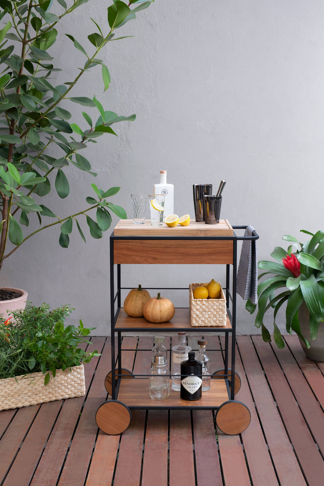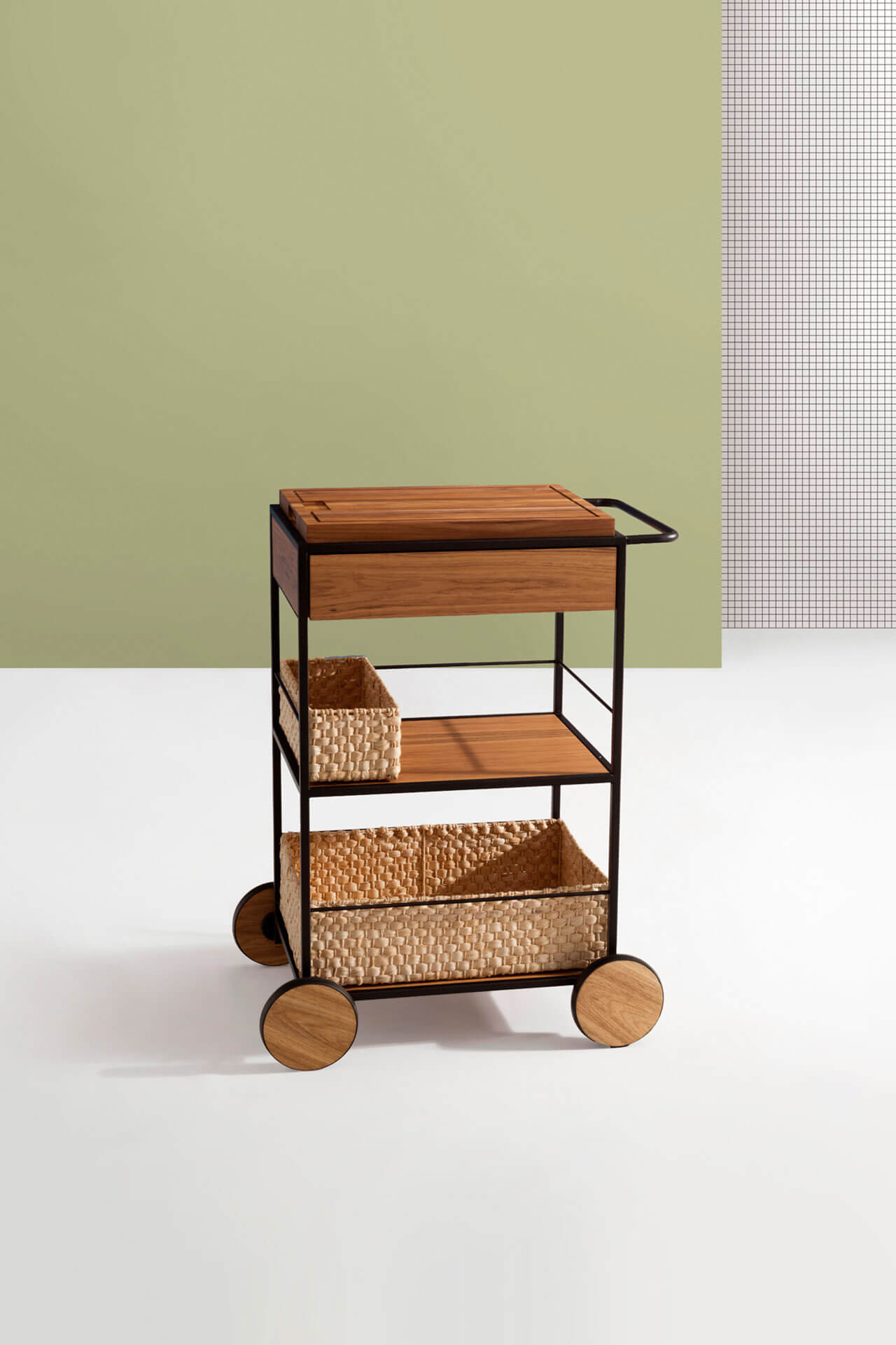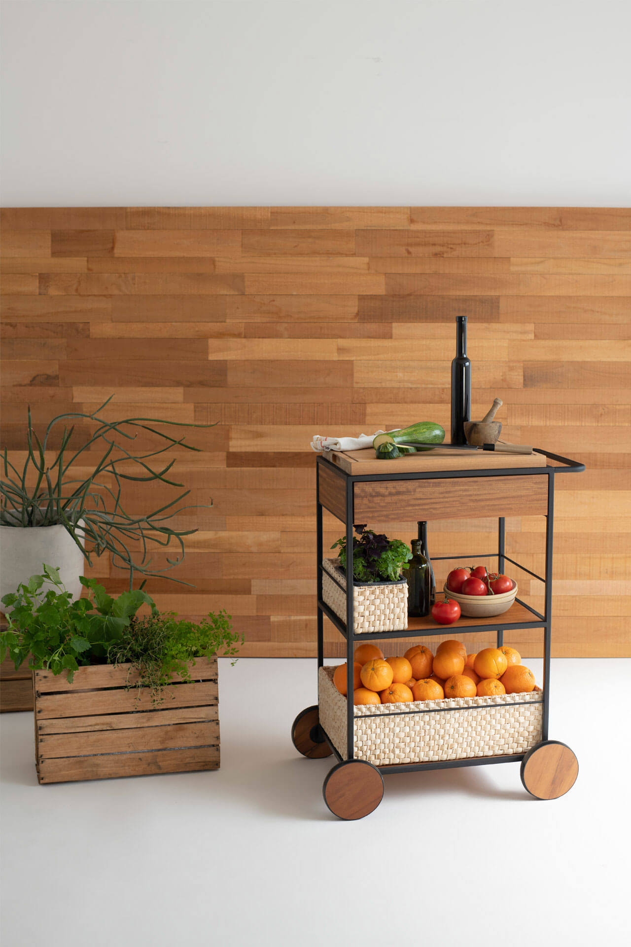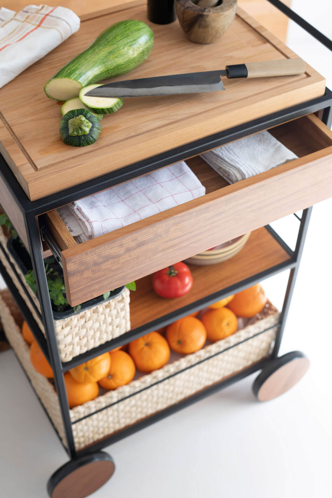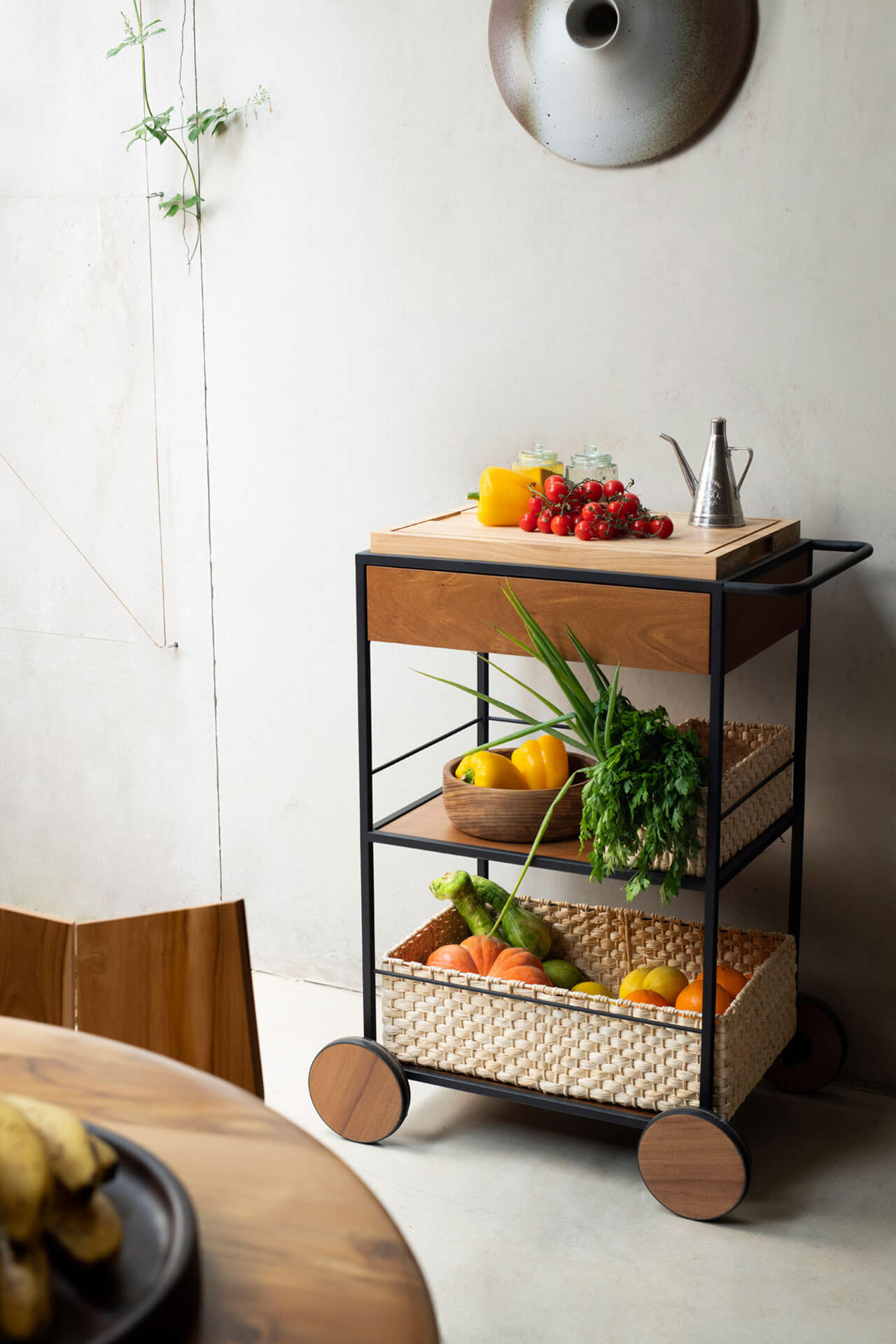O Carrinho Salsa é uma peça versátil e pensada nos mínimos detalhes. Tem uma mistura de três materiais: o metal, a madeira e a palha de milho presente em seus cestos feitos por artesãos. Seus detalhes ficam por conta da gaveta, da tábua de madeira removível e suas charmosas rodas que facilitam a locomoção.