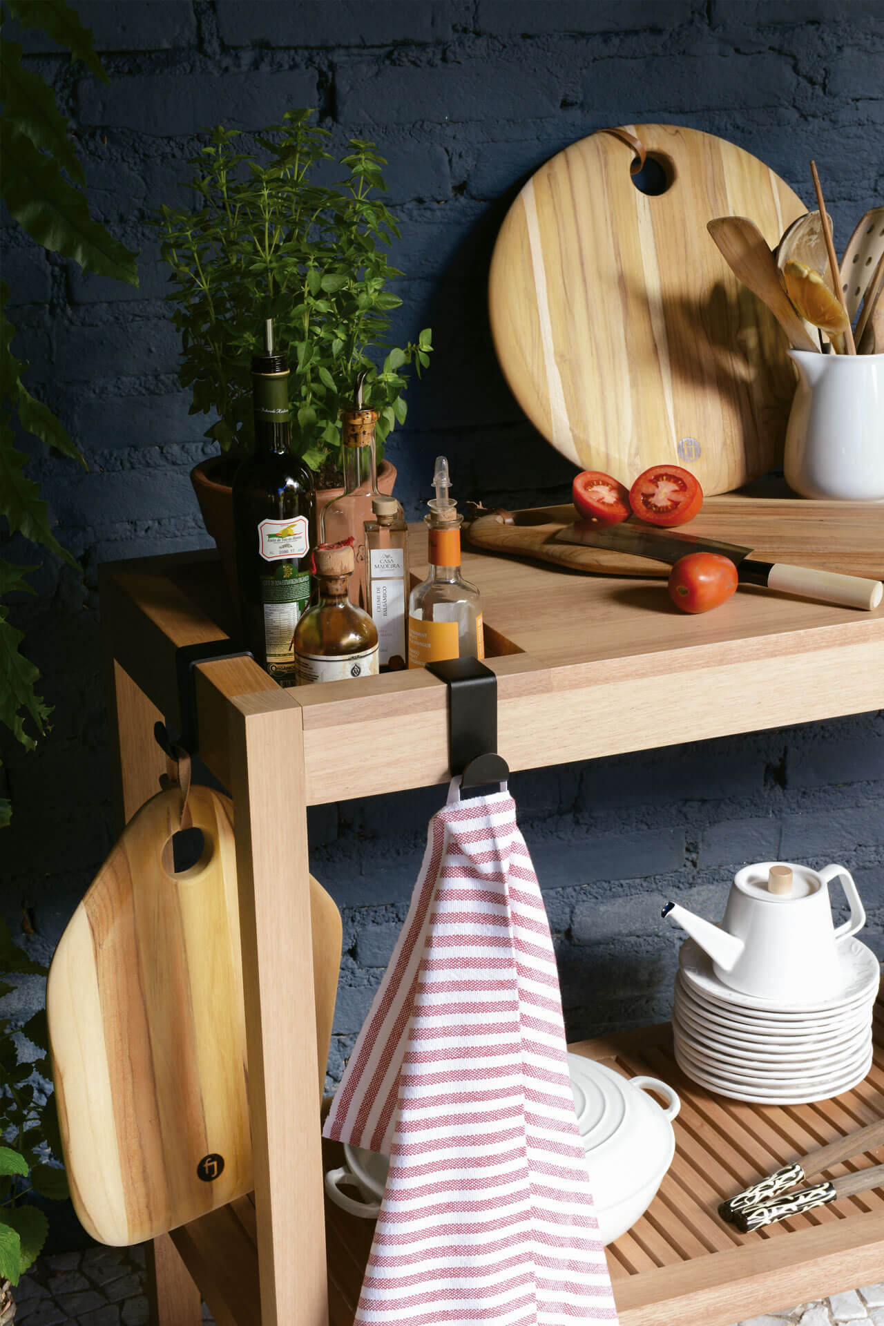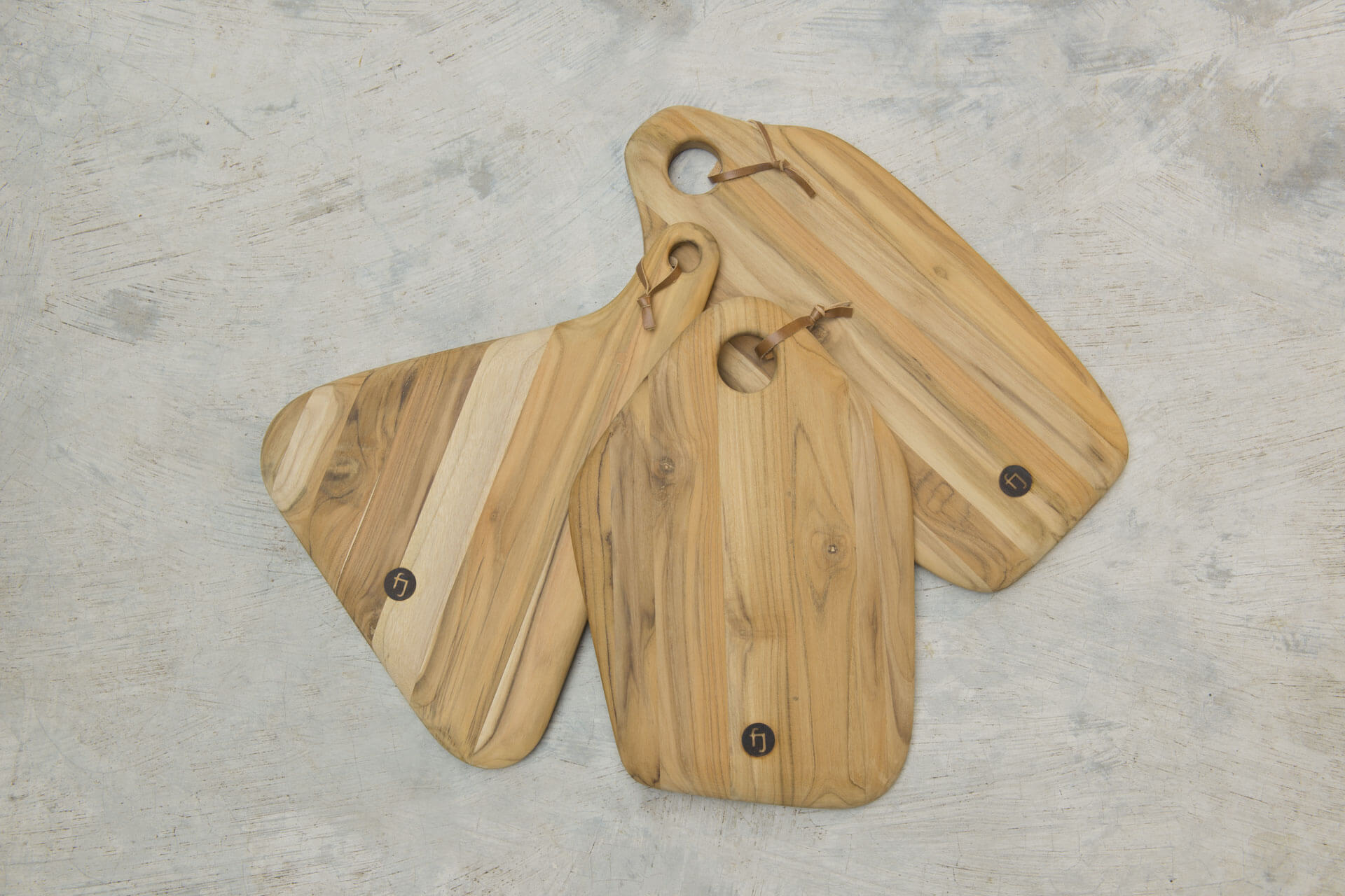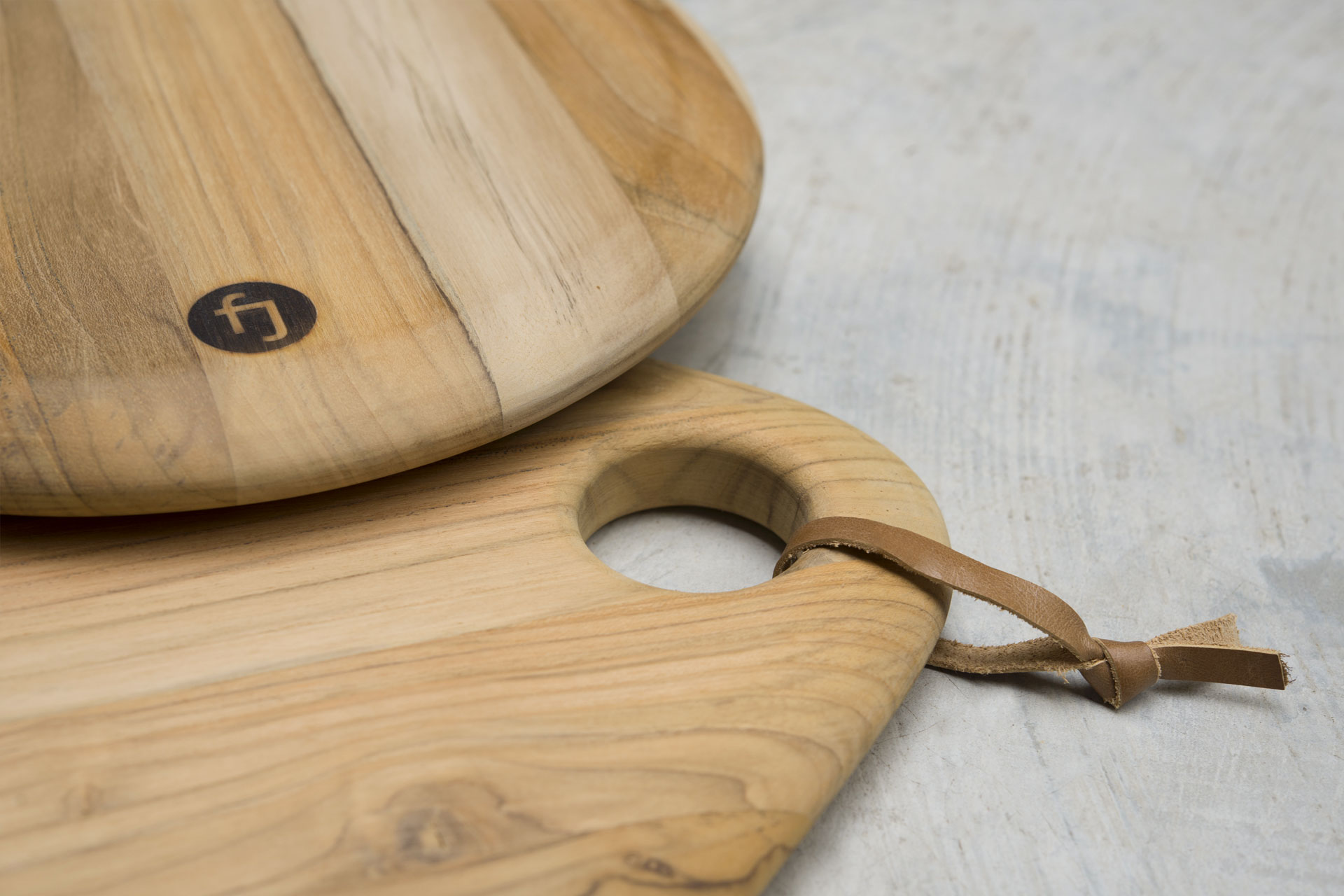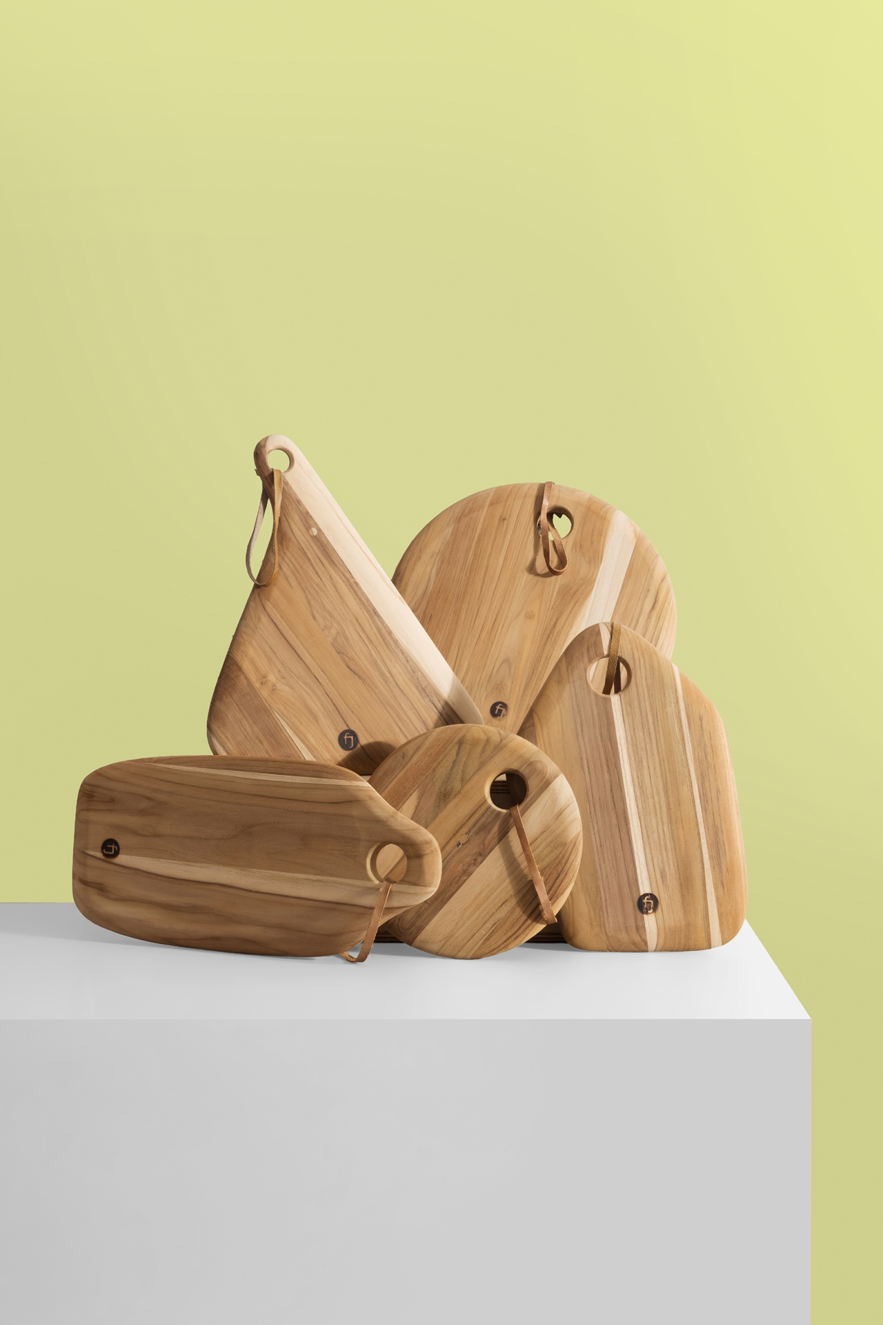 A linha de acessórios da FJ Pronto pra Levar! conta também com uma linha de tábuas - ótimas para servir e dar de presente. São cinco modelos em teca maciça, sendo três com formatos orgânicos e duas redondas - que podem ser usadas separadas ou em conjunto. Todas possuem um furo e um courinho amarrado para serem penduradas.