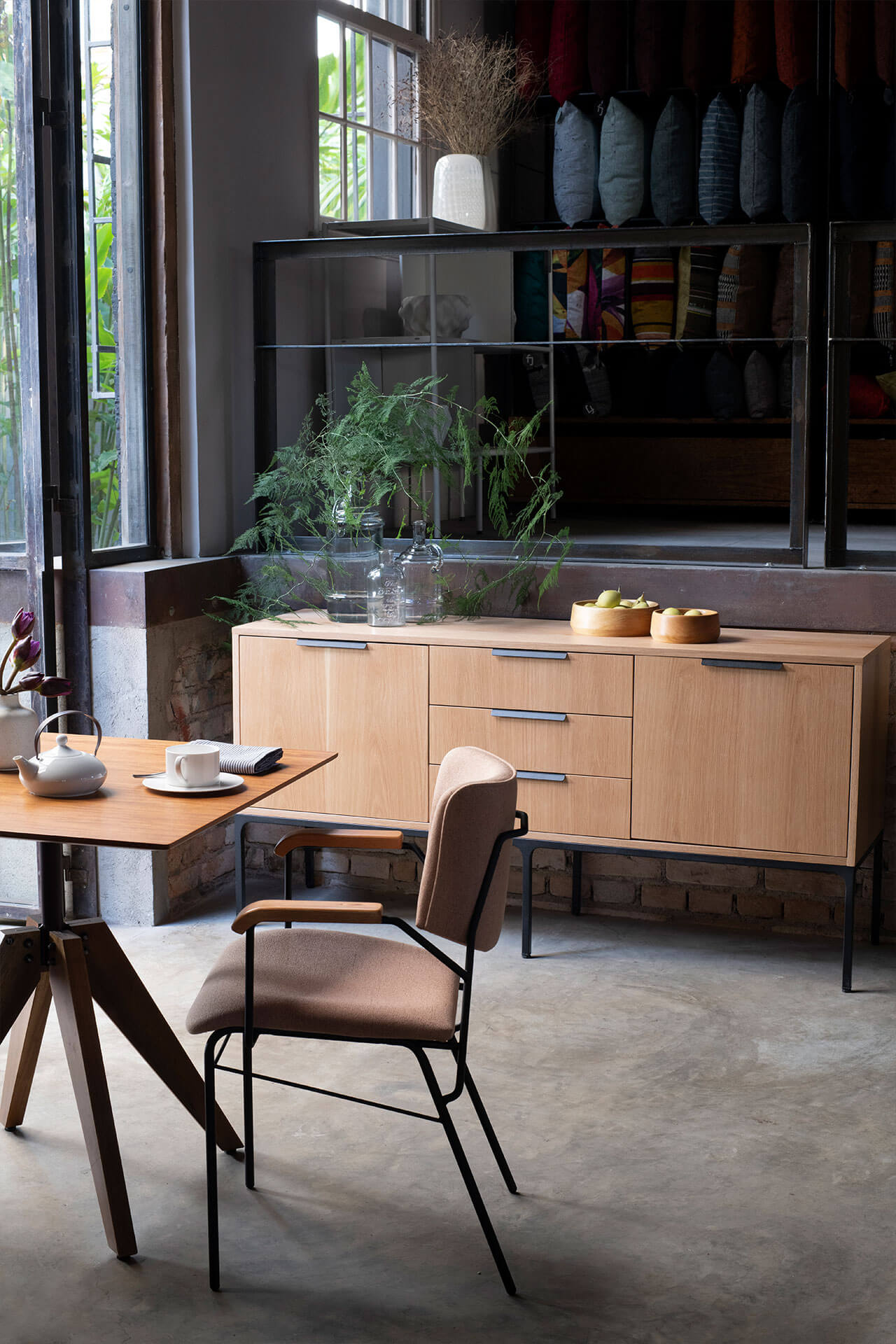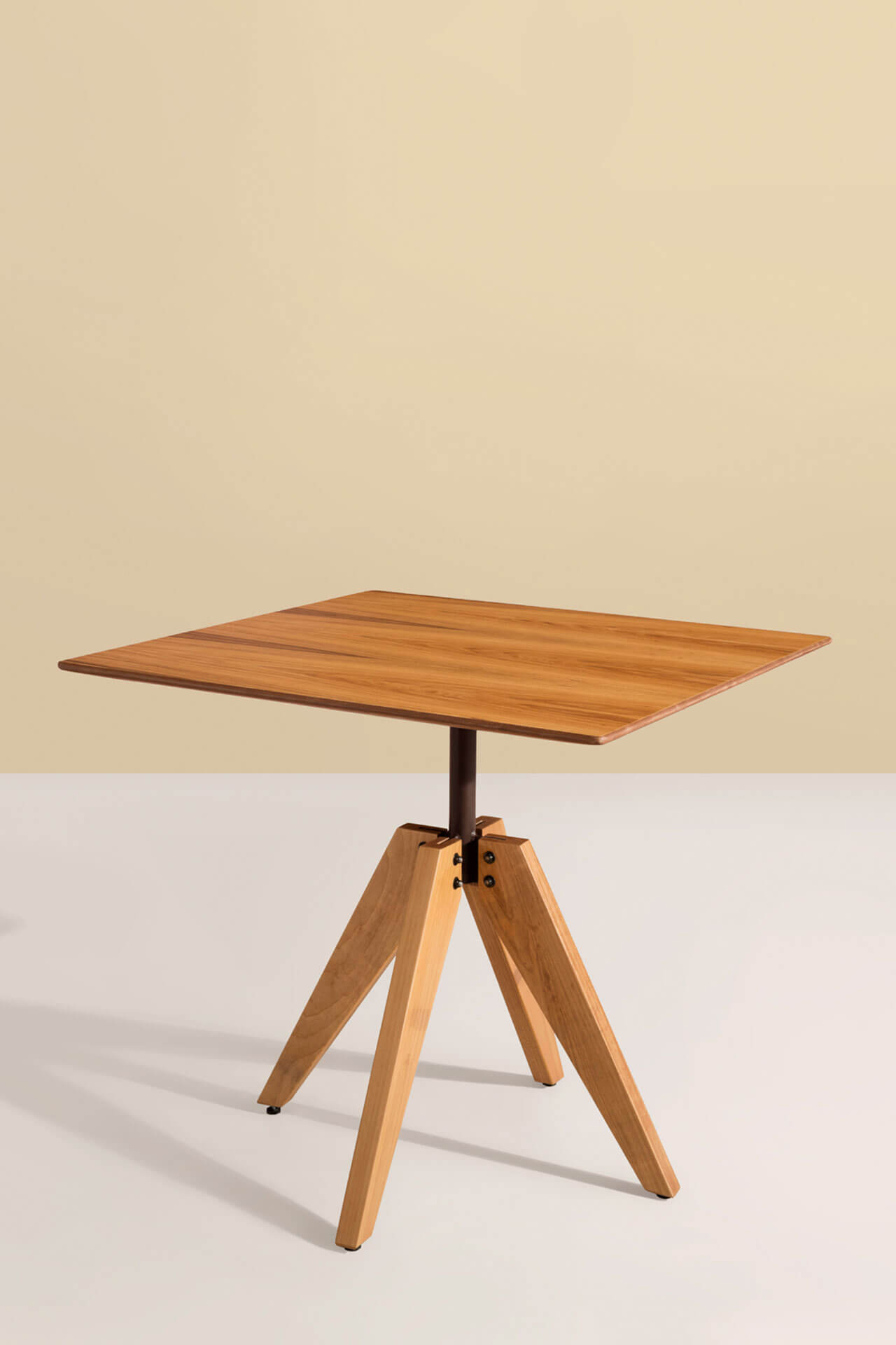 A Mesa Tabuleiro valoriza o uso da madeira. Seus pés de madeira maciça natural são conectados ao tampo por uma haste central de aço. A peça é perfeita para quem não possui muito espaço, mas mesmo assim quer um móvel diferente e cheio de presença. Disponível nas versões: tampo quadrado, redondo ou retangular (essa última possui duas bases).