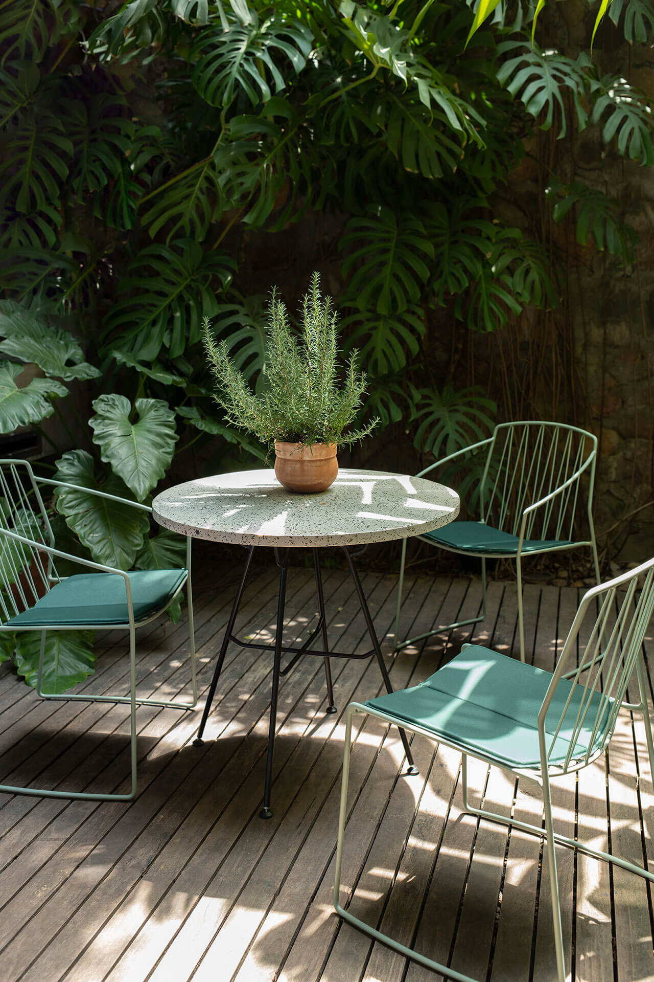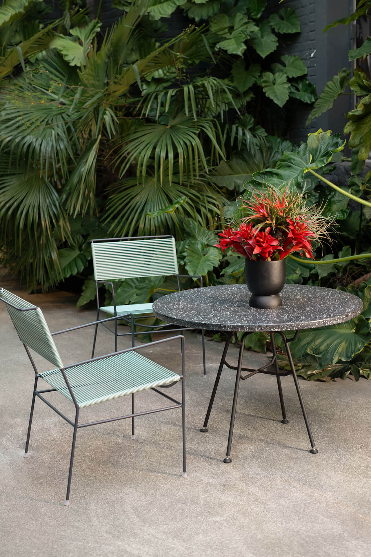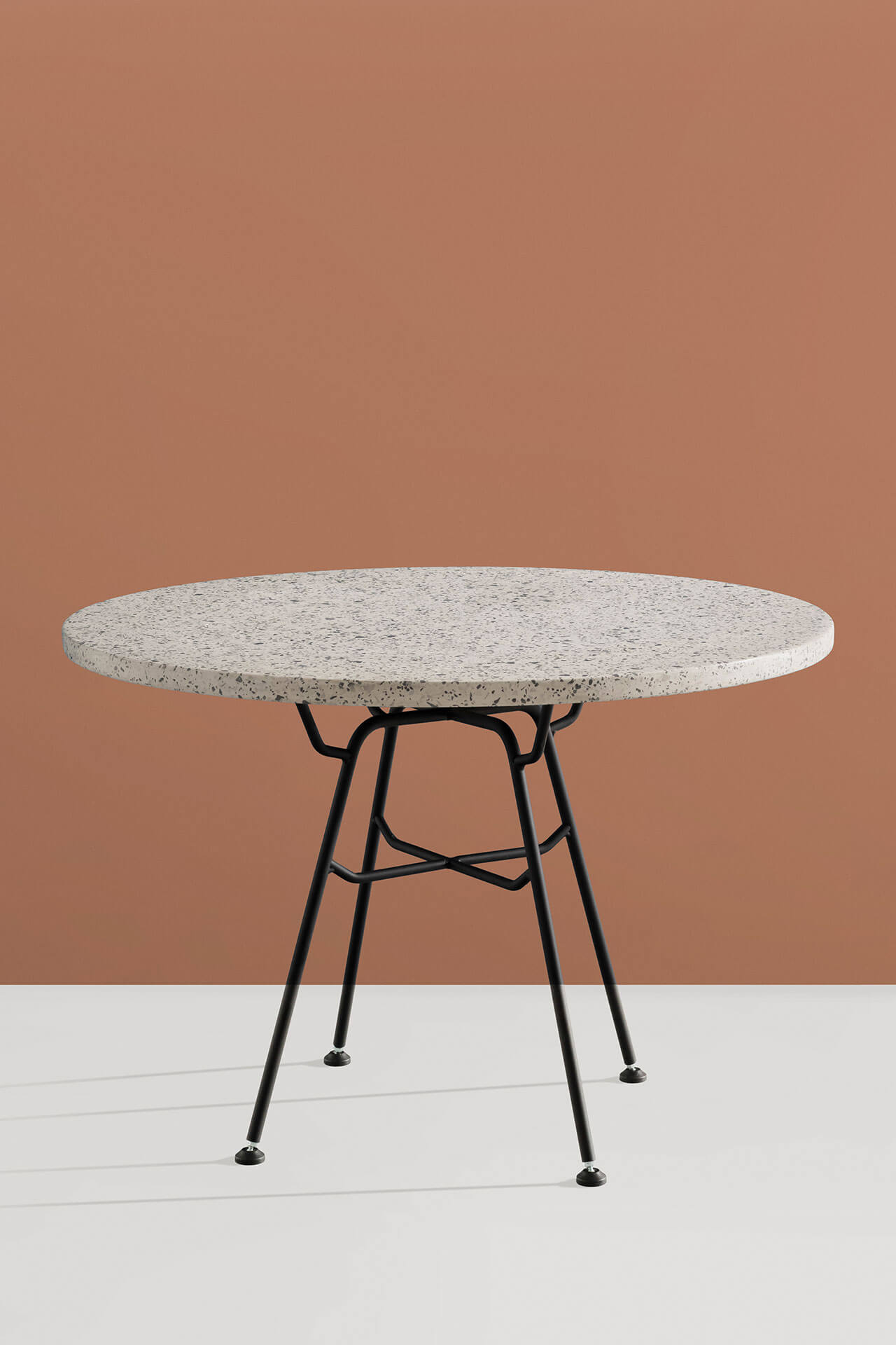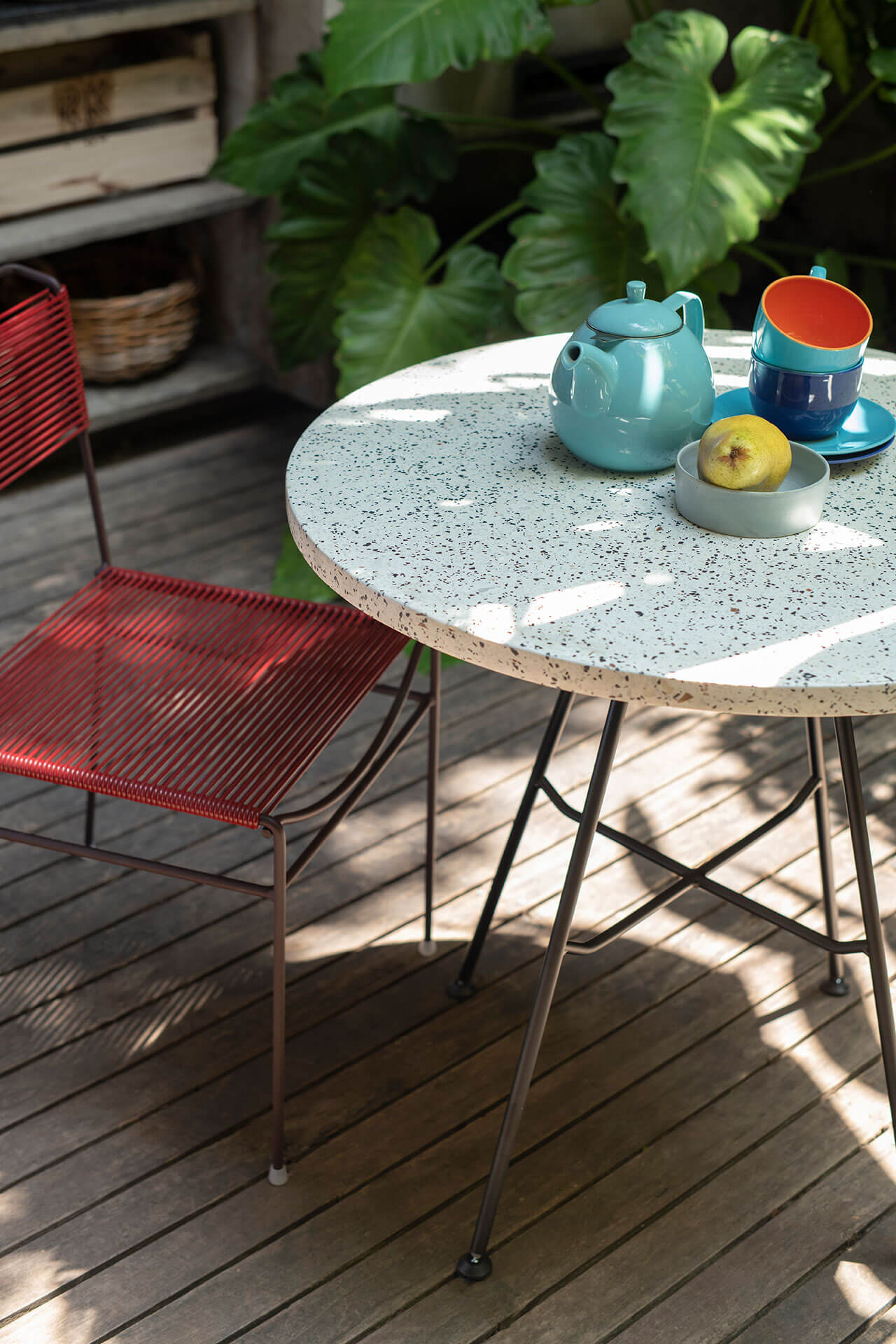 A mesa Vergalhão foi projetada para ser utilizada em pequenos ambientes, desde cozinhas, varandas gourmet a salas. Sua estrutura, que é toda feita em vergalhão maciço, é sempre pintada nas cores preto fosco ou gelo. Nesta versão a mesa recebe um tampo de granilite com acabamento polido fosco na cor branca com pedras pretas ou preto com pedras brancas, exclusivos da Fernando Jaeger. Disponível em 4 alturas: versão lounge A63 (ideal para ser utilizada com poltronas), baixa A75 (ideal para cadeiras e bancos baixos) e média e alta (ideais para banquetas e cadeiras altas).